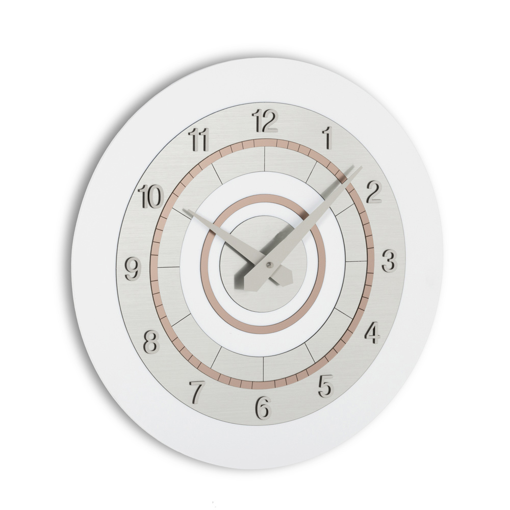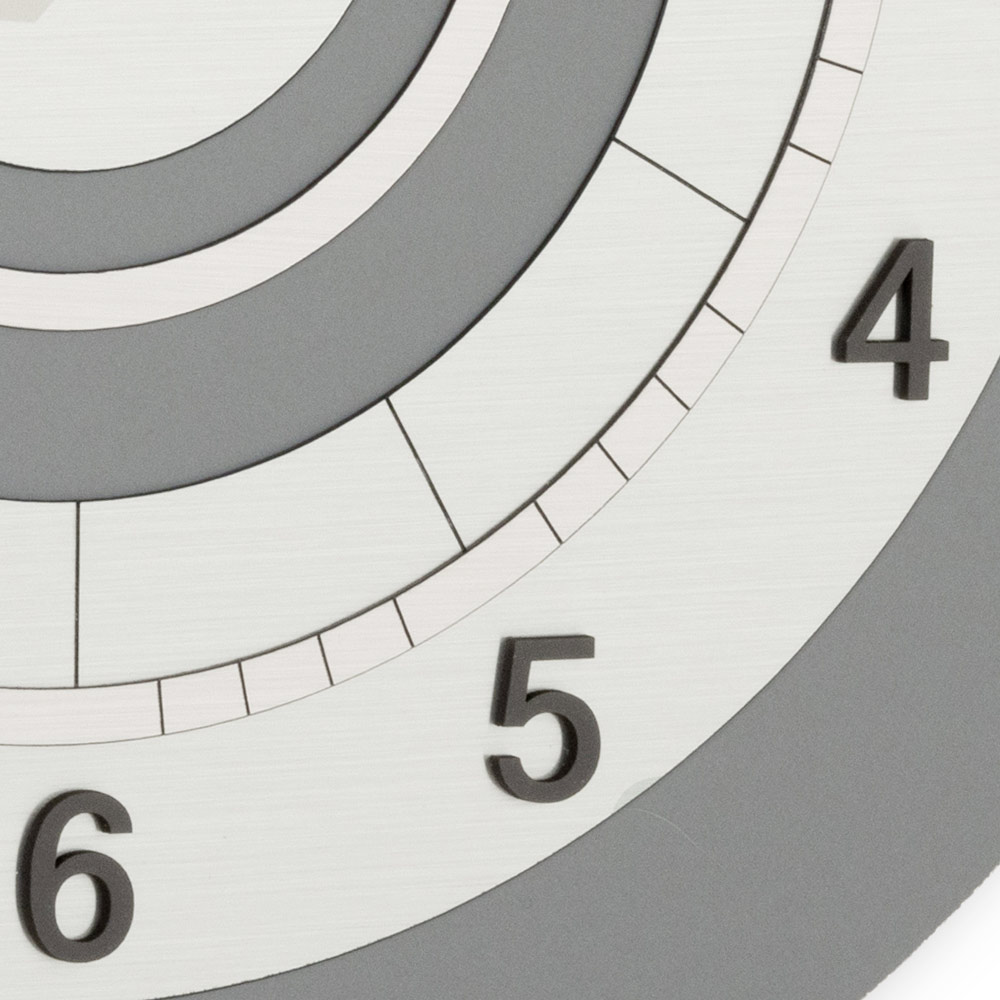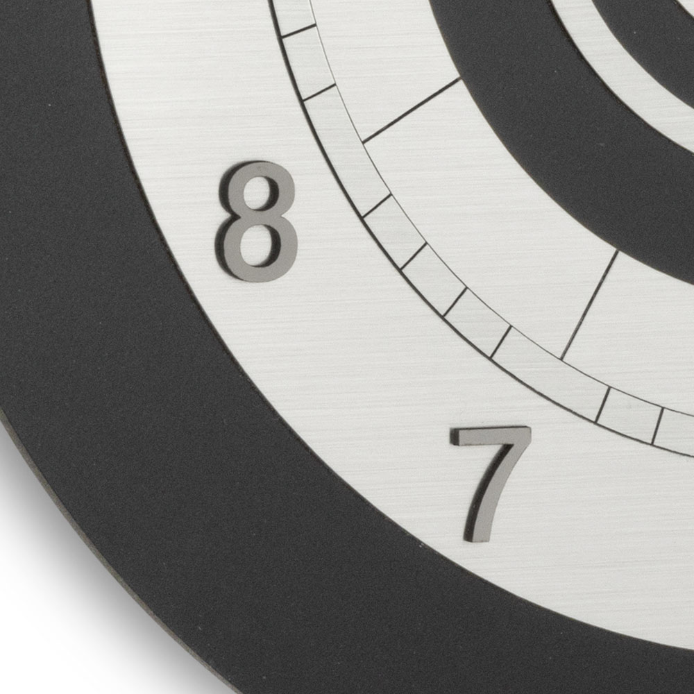 Ramka obejmuje tarczę z wytłoczonymi, eleganckimi i czytelnymi cyframi. Subtelne wskazówki i kontrastujące kolory tworzą równowagę między nowoczesnością i wyrafinowaniem, idealną do współczesnych wnętrz, zarówno domowych, jak i profesjonalnych.