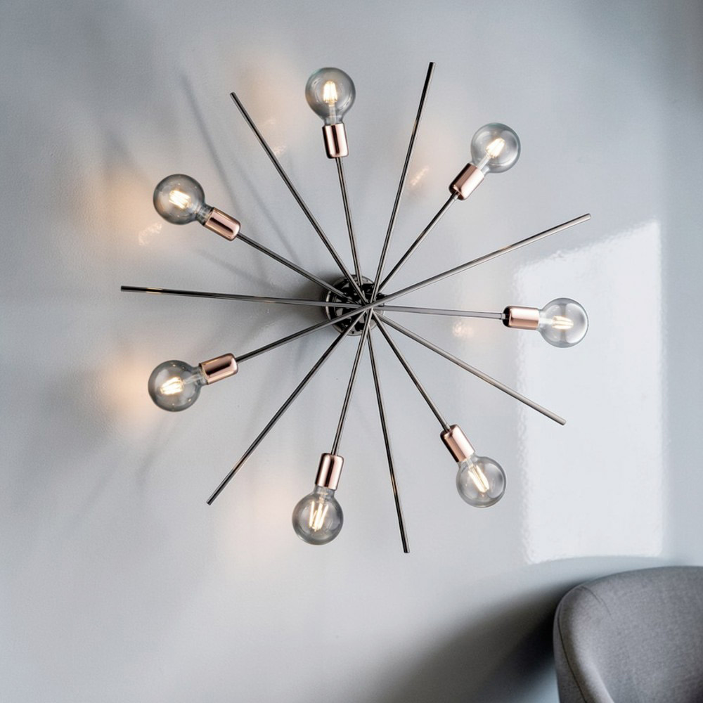 Kultowa i efektowna, ręcznie wykonana lampa sufitowa z czarnego chromu i miedzianego żelaza to nowoczesne i wyrafinowane dzieło. Promienista konstrukcja, inspirowana stylem industrialnym z połowy XX wieku i współczesnym , rozwija się w dynamiczną kompozycję metalowych ramion, które równomiernie i efektownie rozpraszają światło.