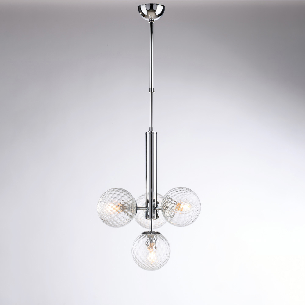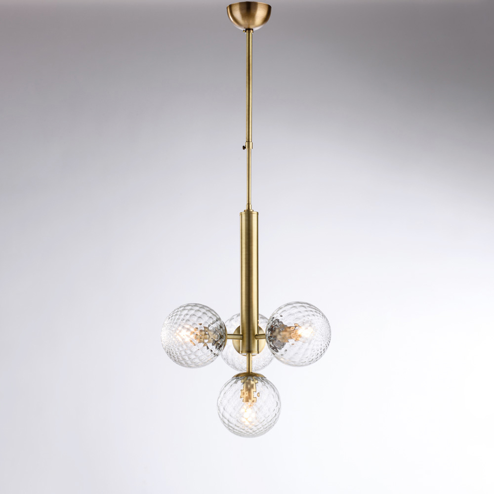 Elegancka i nowoczesna, ta ręcznie wykonana, żelazna lampa wisząca wyróżnia się zrównoważonym i wyrafinowanym designem. Centralna, pionowa konstrukcja podtrzymuje cztery kuliste szklane dyfuzory , tworząc harmonijną kompozycję świetlną, która równomiernie i otula światłem.