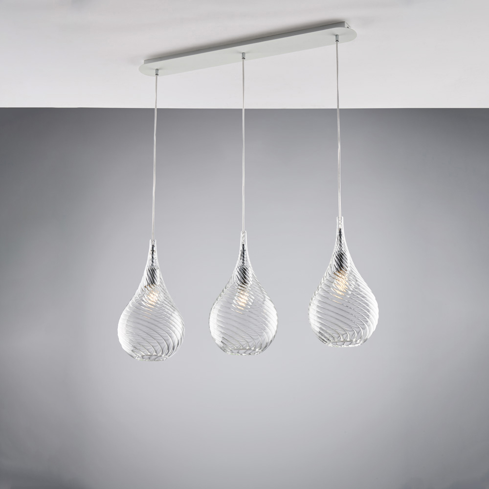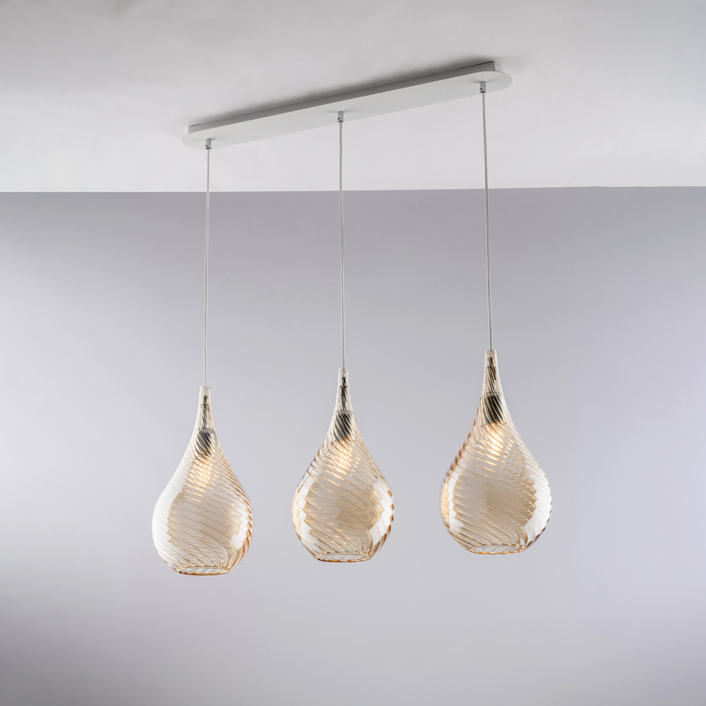 Elegancka i funkcjonalna, ręcznie wykonana, żelazna lampa wisząca ze szkłem Pyrex to nowoczesne rozwiązanie oświetleniowe, zaprojektowane, aby wzbogacić przestrzeń harmonijną i lekką formą. Trzy faliste, eleganckie klosze ze szkła Pyrex zawieszone są na liniowej szynie, co zapewnia równomierne rozproszenie światła i silny efekt estetyczny.