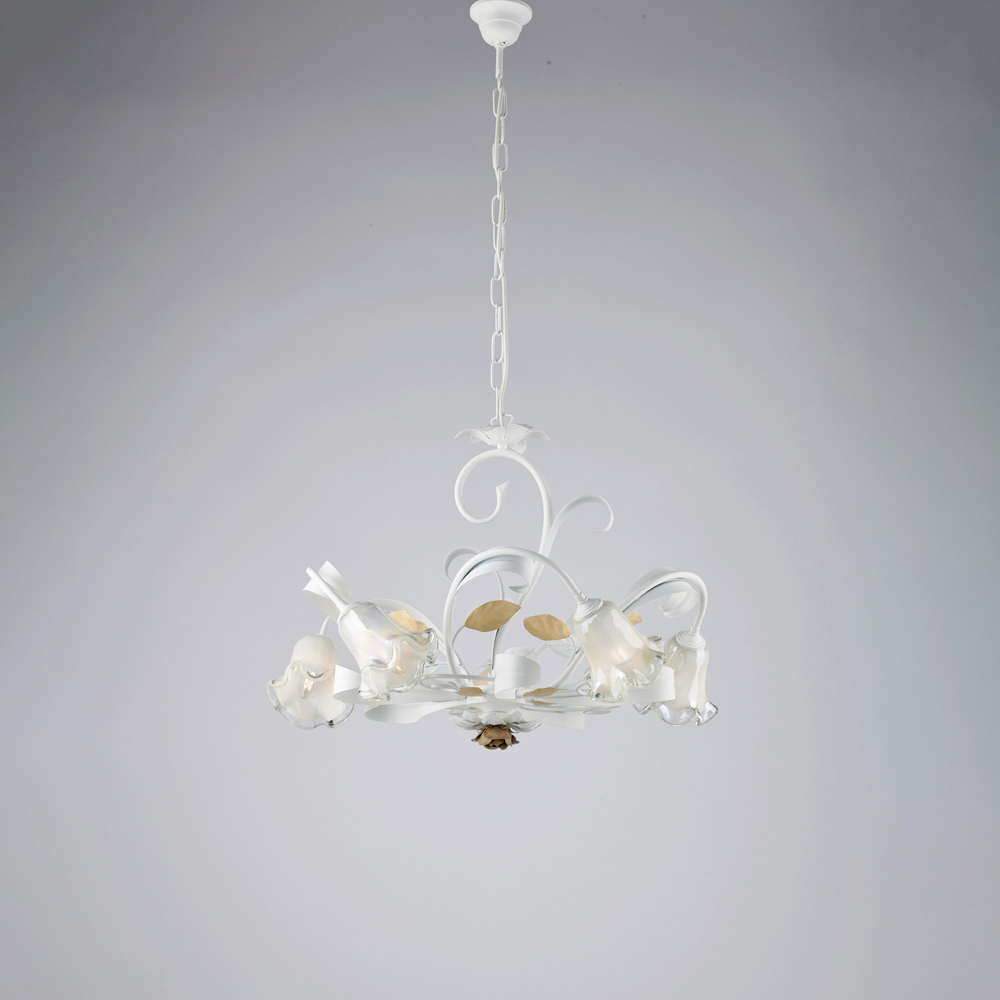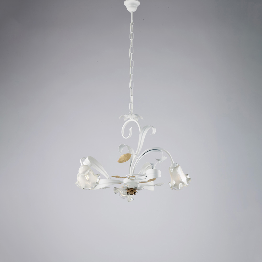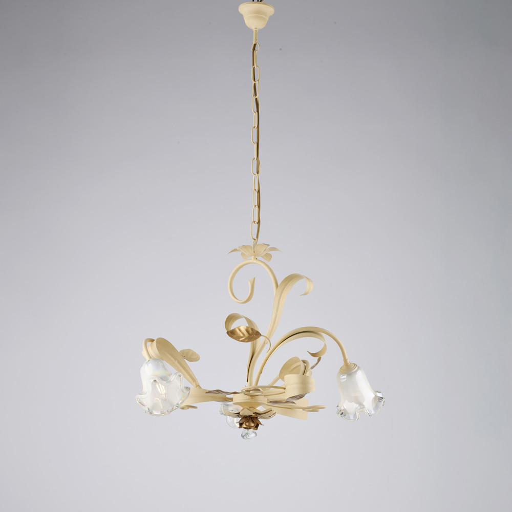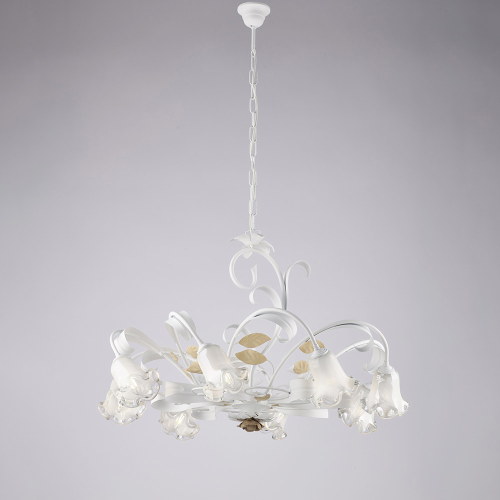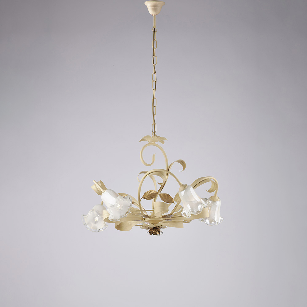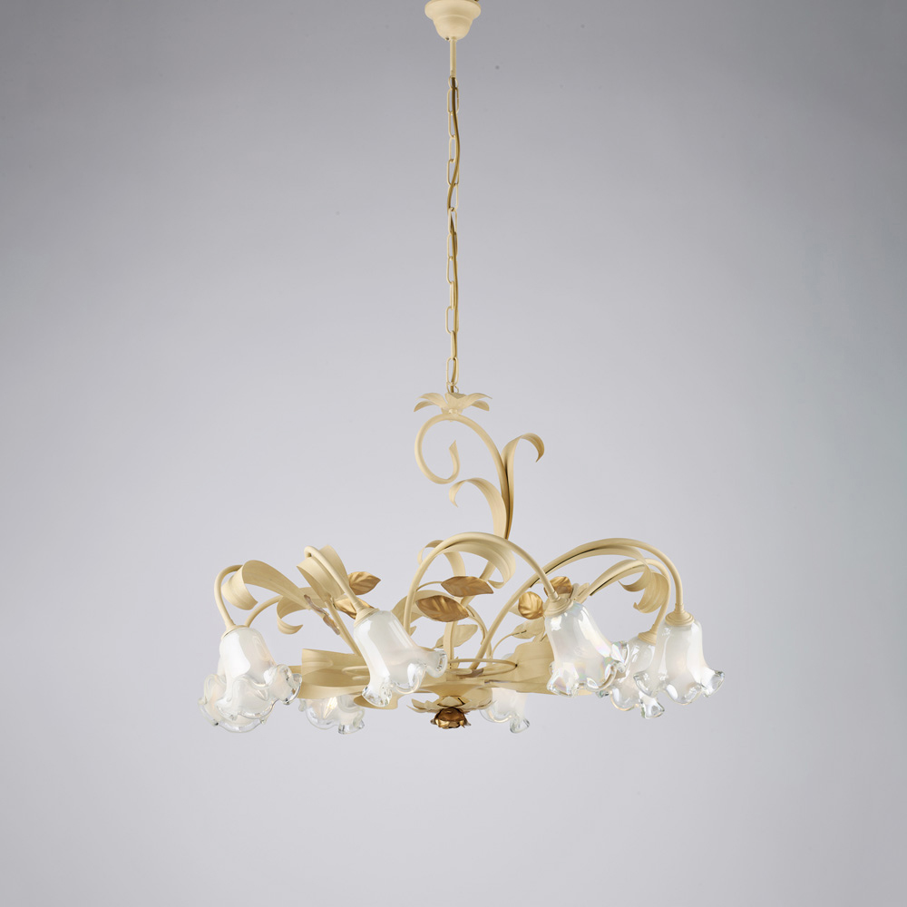 Romantyczny i elegancki, ten klasyczny żyrandol, ręcznie wykonany z żelaza lakierowanego na kolor kości słoniowej, to świetliste dzieło, które przywołuje na myśl urok włoskiej tradycji, zinterpretowany na nowo z wyrafinowanym smakiem. Falista konstrukcja, wzbogacona dekoracyjnymi lokami i szklanym kloszem w kształcie kwiatu , nadaje wnętrzu lekkości i harmonii, tworząc ciepłą i przyjazną atmosferę.