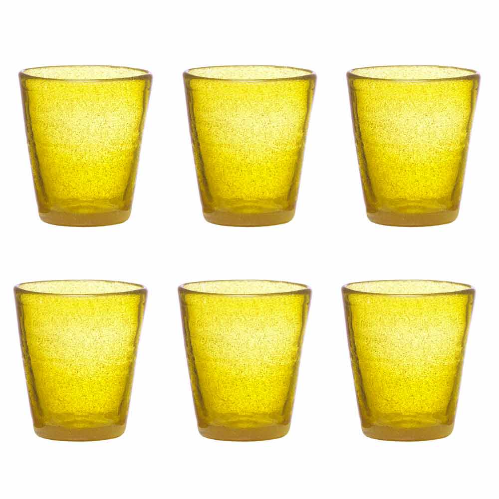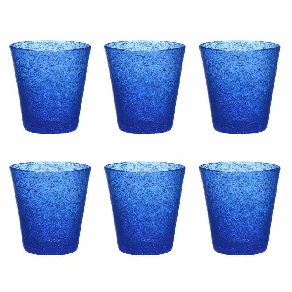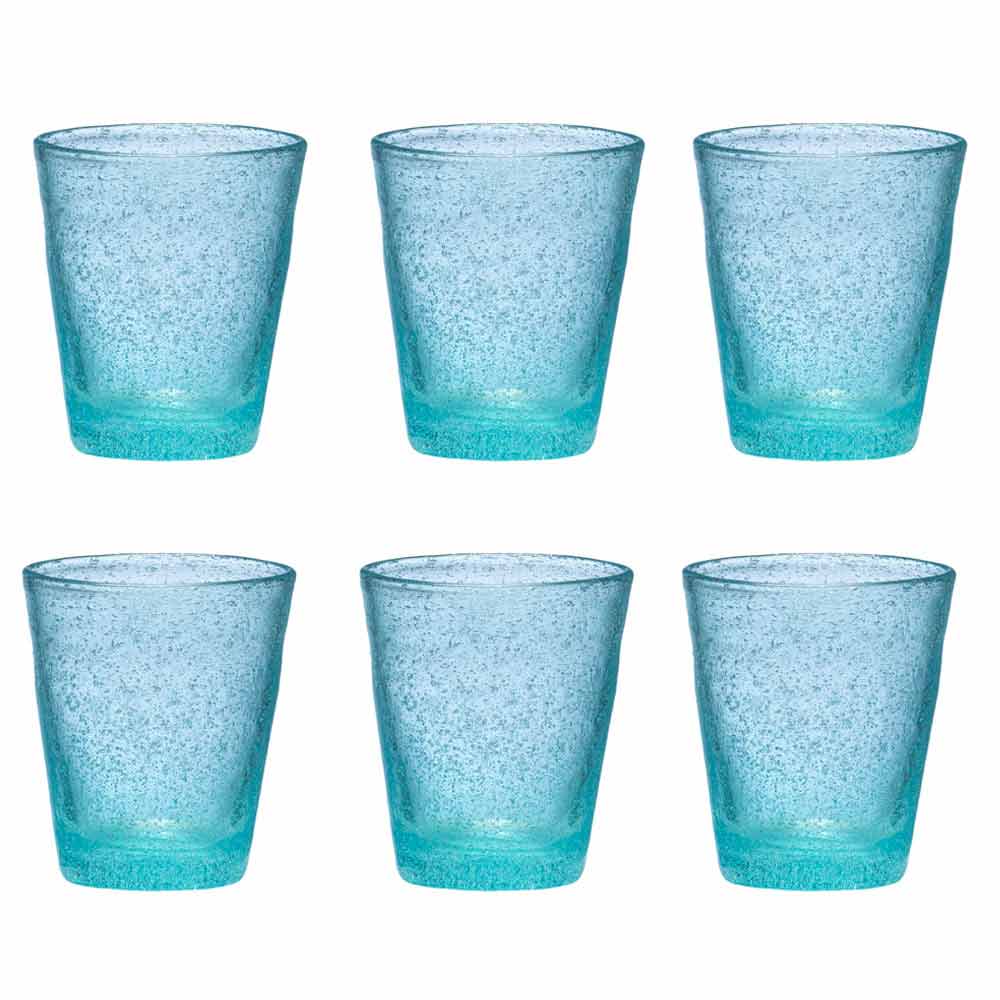 12 kolorowych szklanek do wody lub napojów, wykonanych z dmuchanego szkła o nowoczesnym designie.