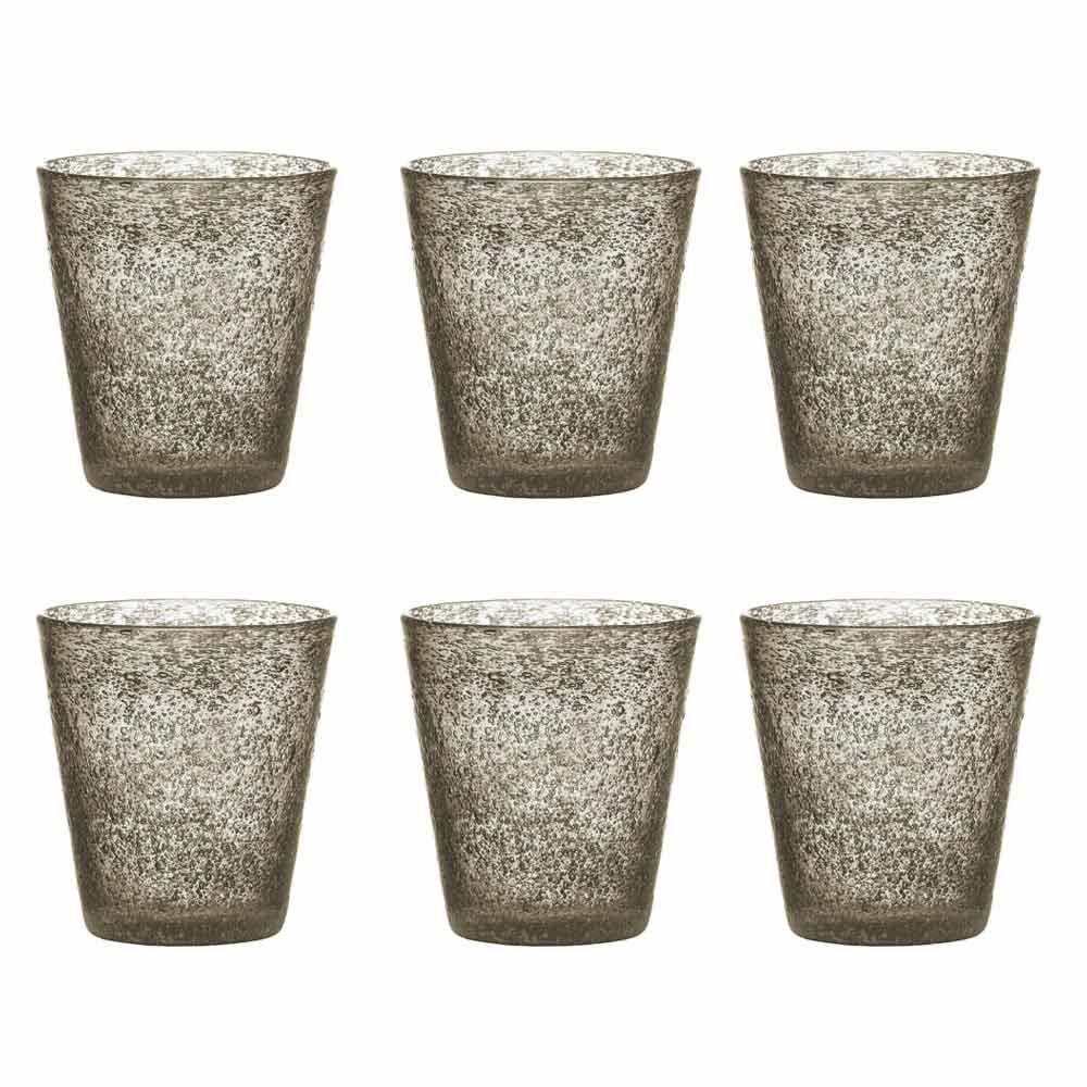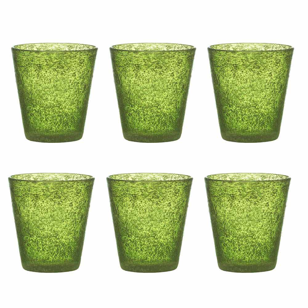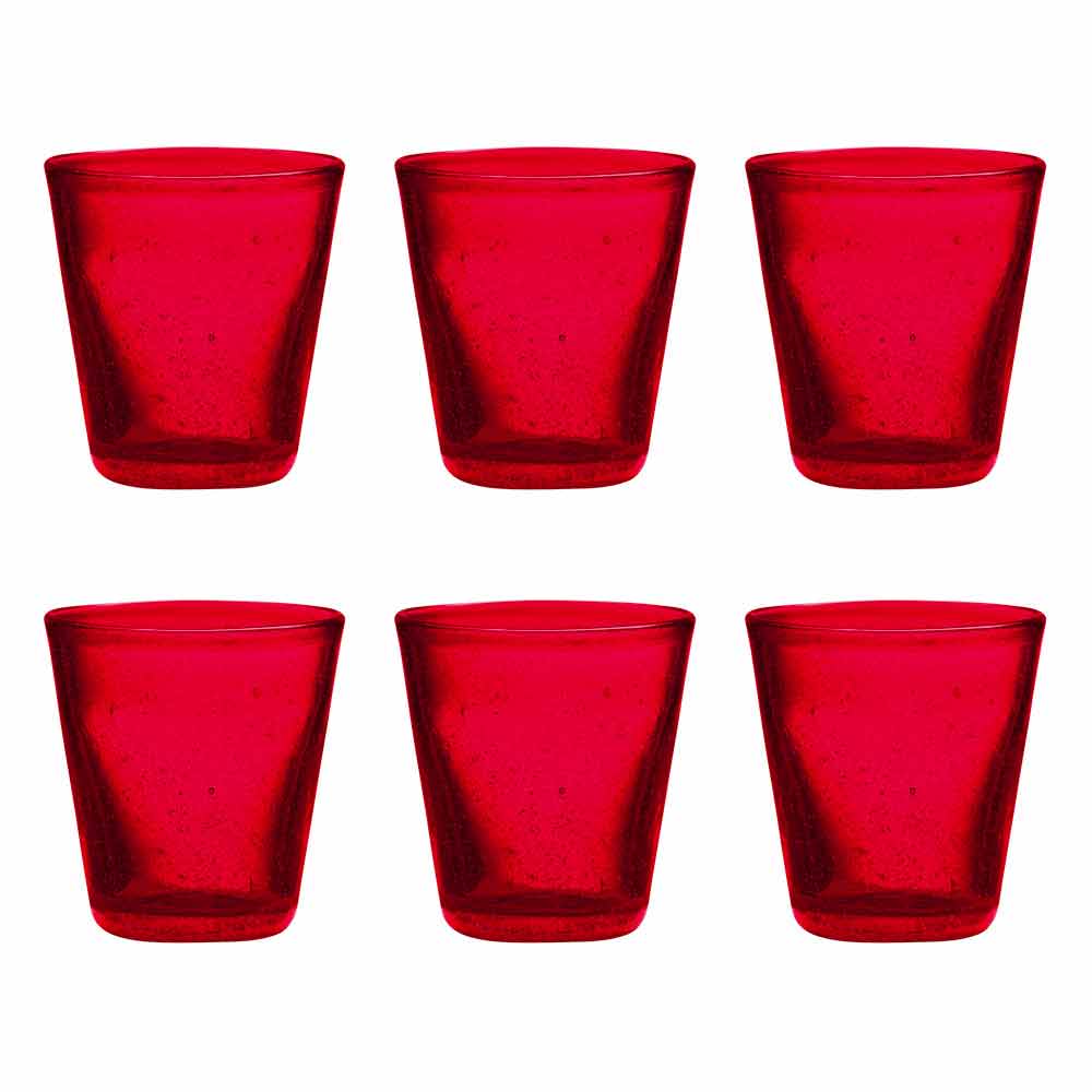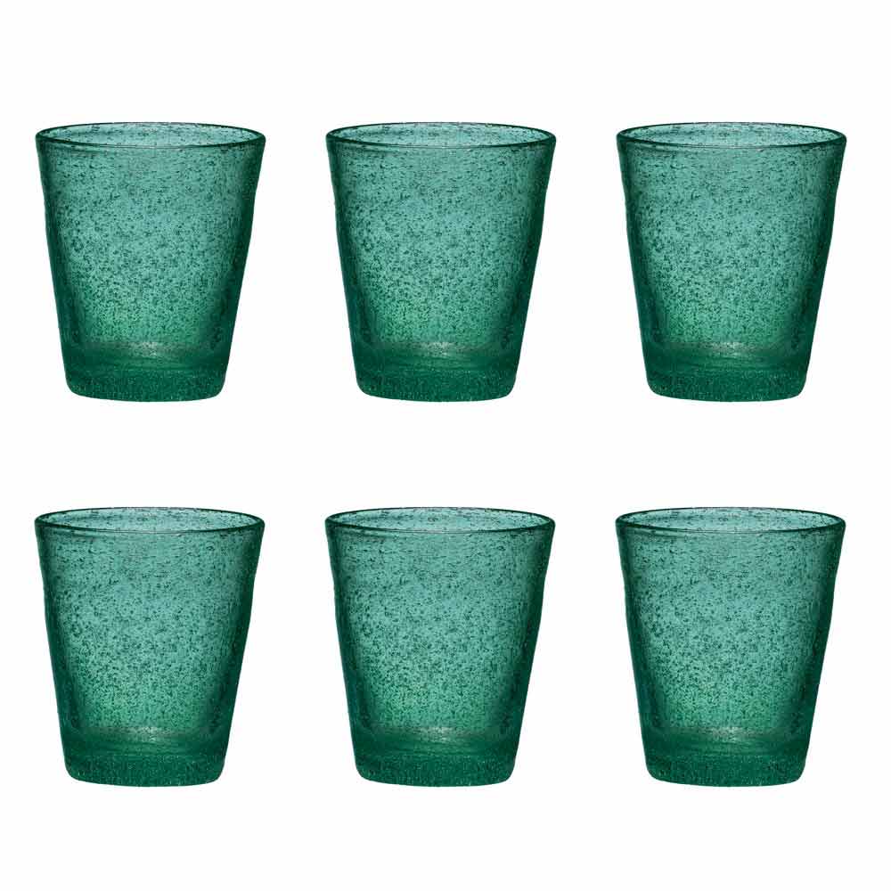 12 kolorowych szklanek do wody lub napojów, wykonanych z dmuchanego szkła o nowoczesnym designie.
