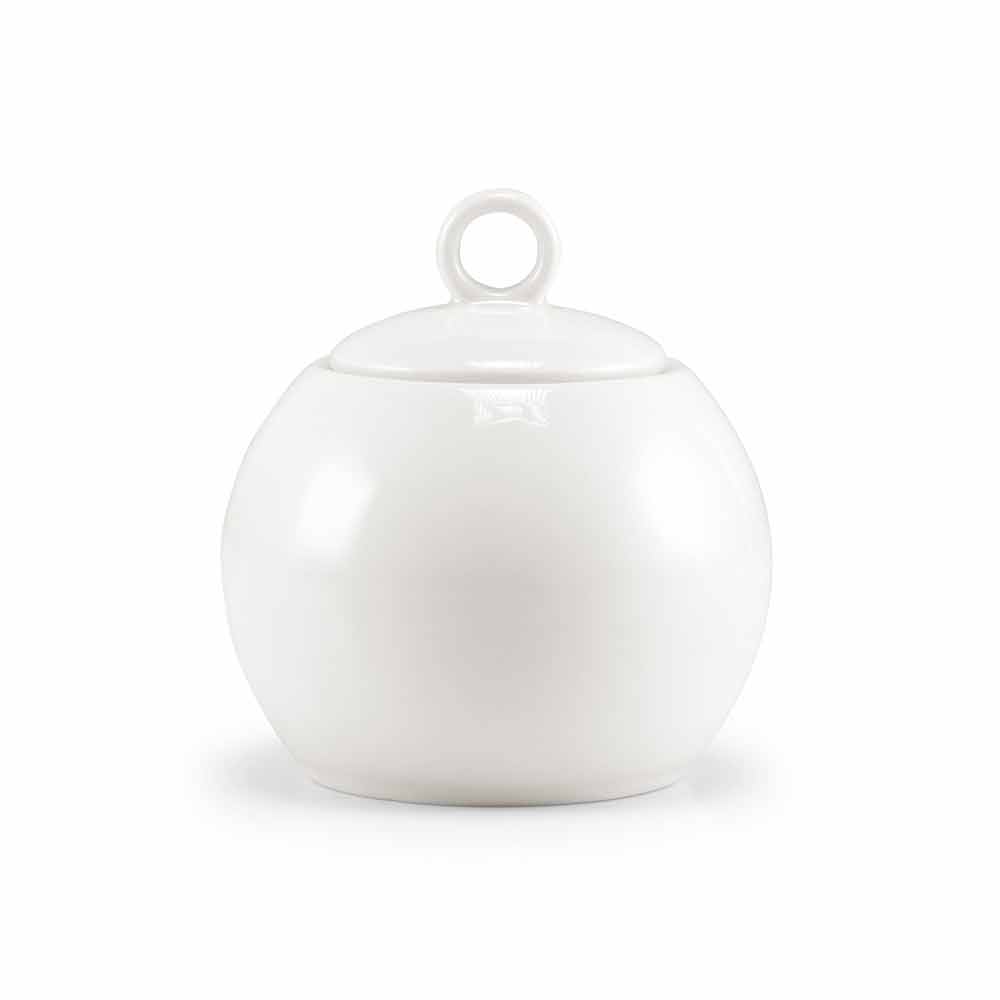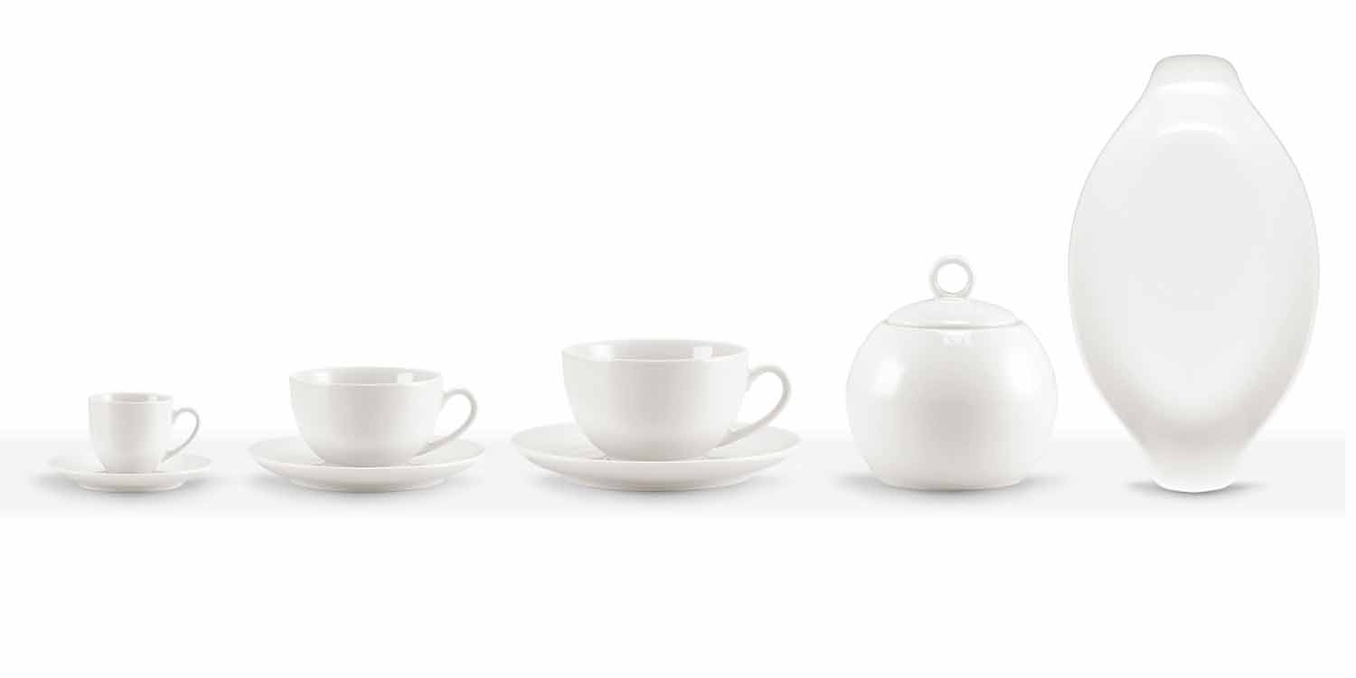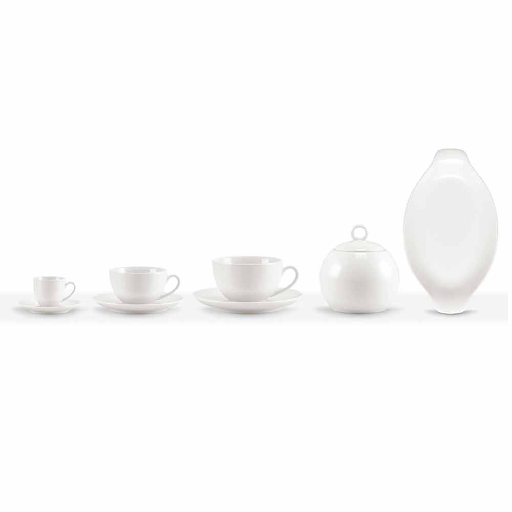 Serwis filiżanek kawy, herbaty, śniadania z cukiernicą i spodkiem o nowoczesnym wzornictwie z białej porcelany, 20 sztuk.