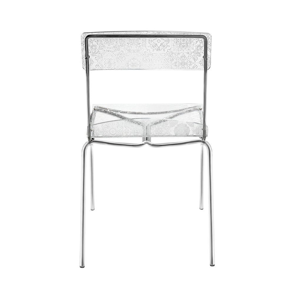 Krzesło zostało fachowo wykonane w 100% z pierwotnego pleksiglasu polimerowego i ma przezroczystą skorupę, która podkreśla jego wyjątkową geometrię. Każdy narożnik, każda linia i każda krzywa zostały zaprojektowane tak, aby wychwytywać i odbijać światło, zachowując jego nienaganny blask rok po roku.