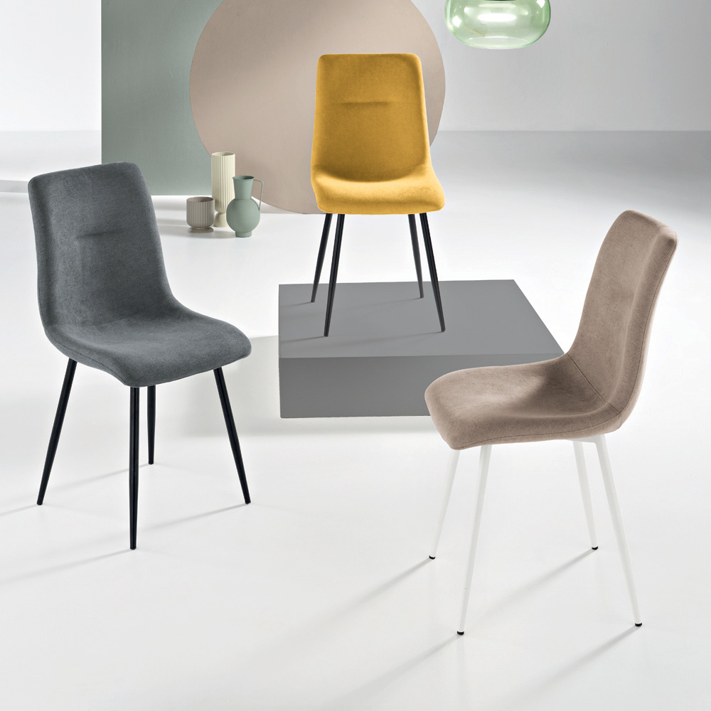 Elegancki zestaw 4 nowoczesnych krzeseł zaprojektowanych z myślą o stylowym umeblowaniu jadalni , kuchni lub salonu . Siedzisko tapicerowane tkaniną z miękkim wypełnieniem zapewnia wygodę i przytulne wnętrze, a malowana metalowa rama gwarantuje solidność i trwałość.