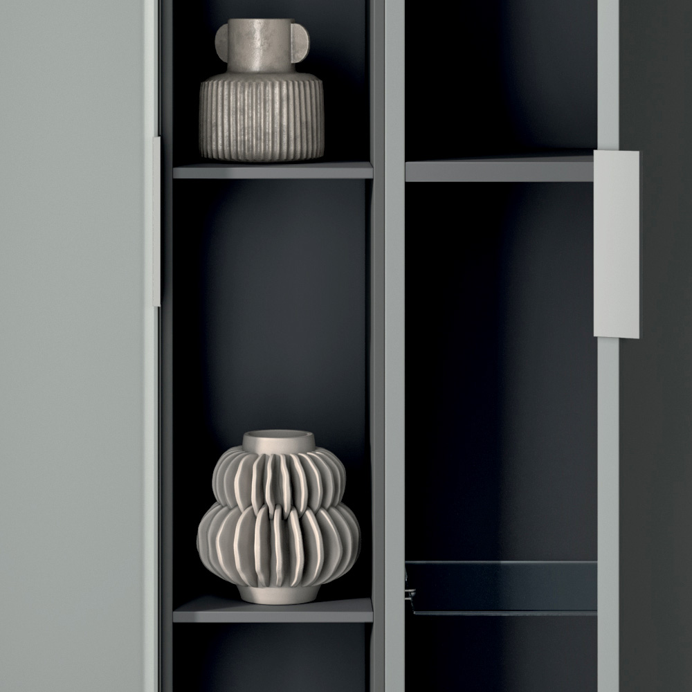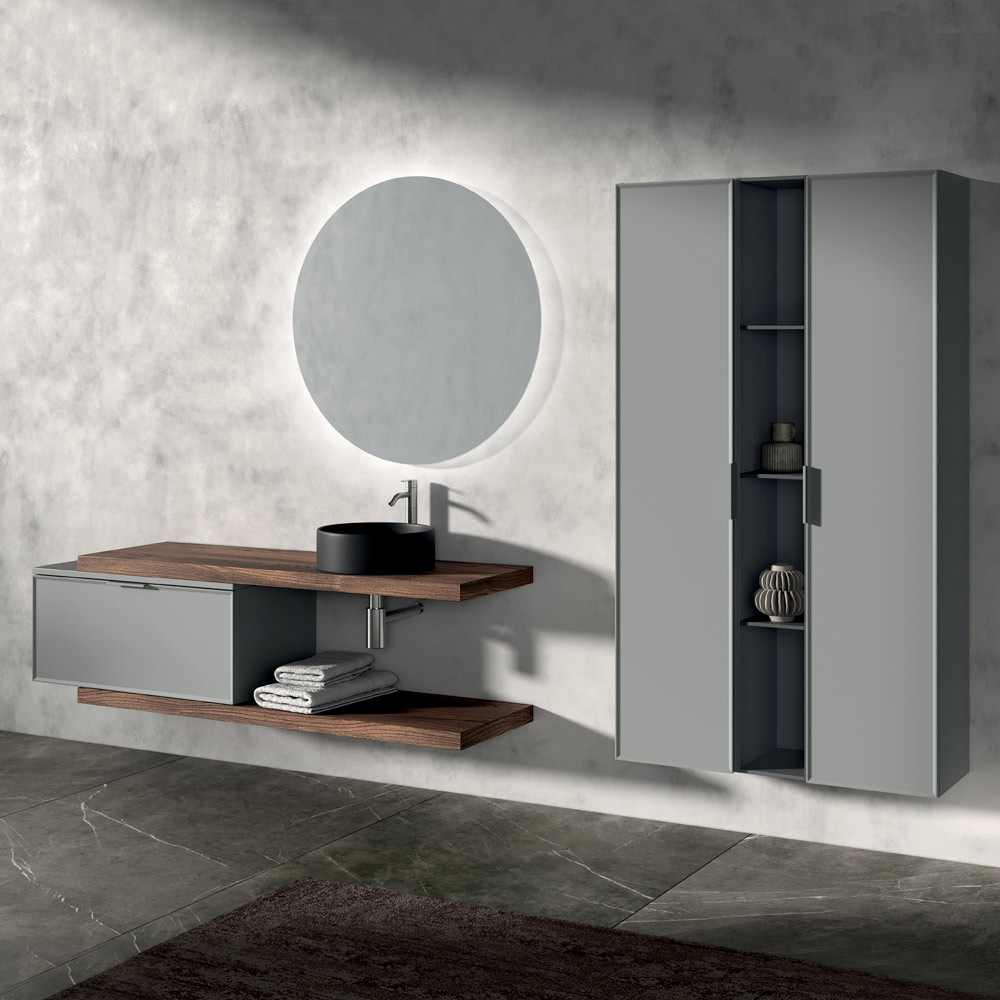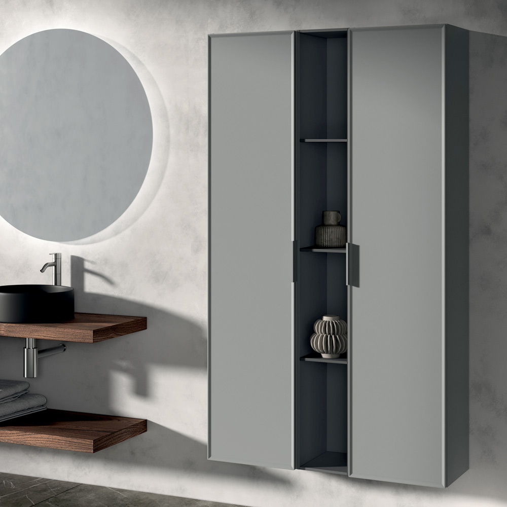 Kompozycję wzbogacają pionowe kolumny do przechowywania oraz otwarty element w kolorze antracytu , idealny do uporządkowania akcesoriów i przedmiotów, przy jednoczesnym zachowaniu uporządkowanego i współczesnego stylu.