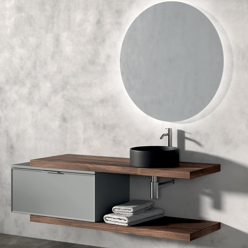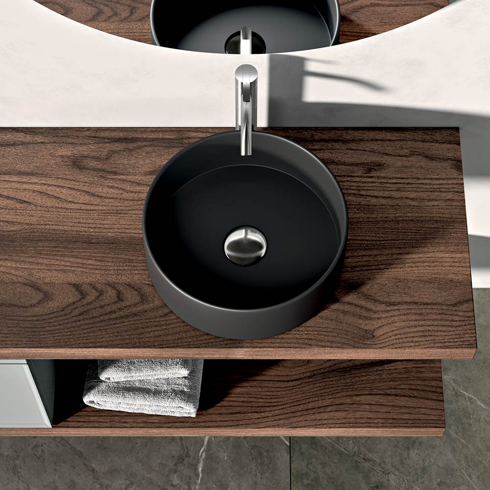 Dwa blaty z dębu Rio wprowadzają naturalny i ciepły element, tworząc przyjemny kontrast materiałowy z okrągłą umywalką nablatową z matowej czarnej ceramiki , prawdziwym wizualnym bohaterem kompozycji.