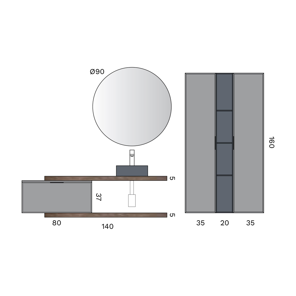 Wyrafinowana, współczesna kompozycja łazienkowa , charakteryzująca się eleganckim kontrastem ciemnych powierzchni, drewnianych detali i minimalistycznych brył. Propozycja zaprojektowana z myślą o nowoczesnych łazienkach o wyrazistym charakterze architektonicznym.