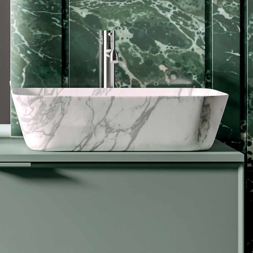 Ceramiczna umywalka nablatowa z efektem Calacatta wprowadza niezwykle cenny element materiałowy o delikatnym usłojeniu przypominającym naturalny marmur i zdobi cały wystrój łazienki.