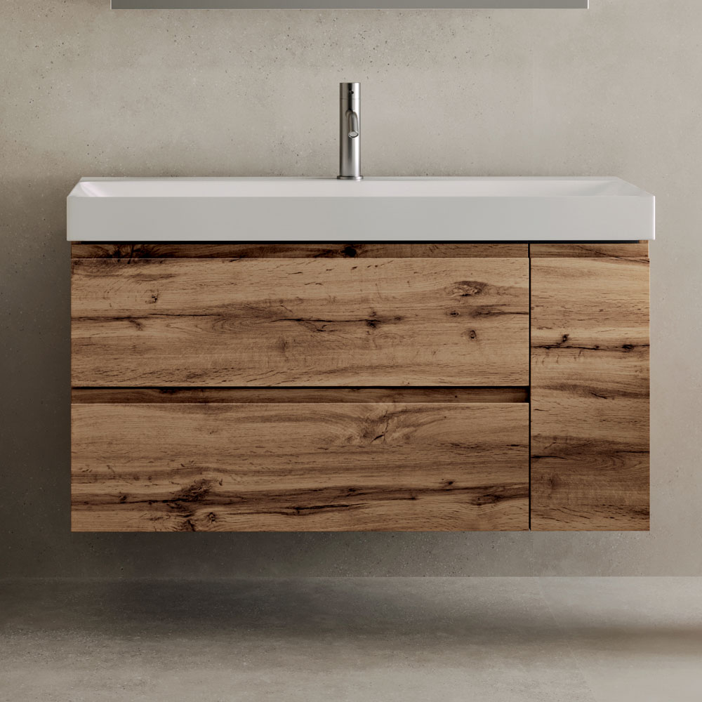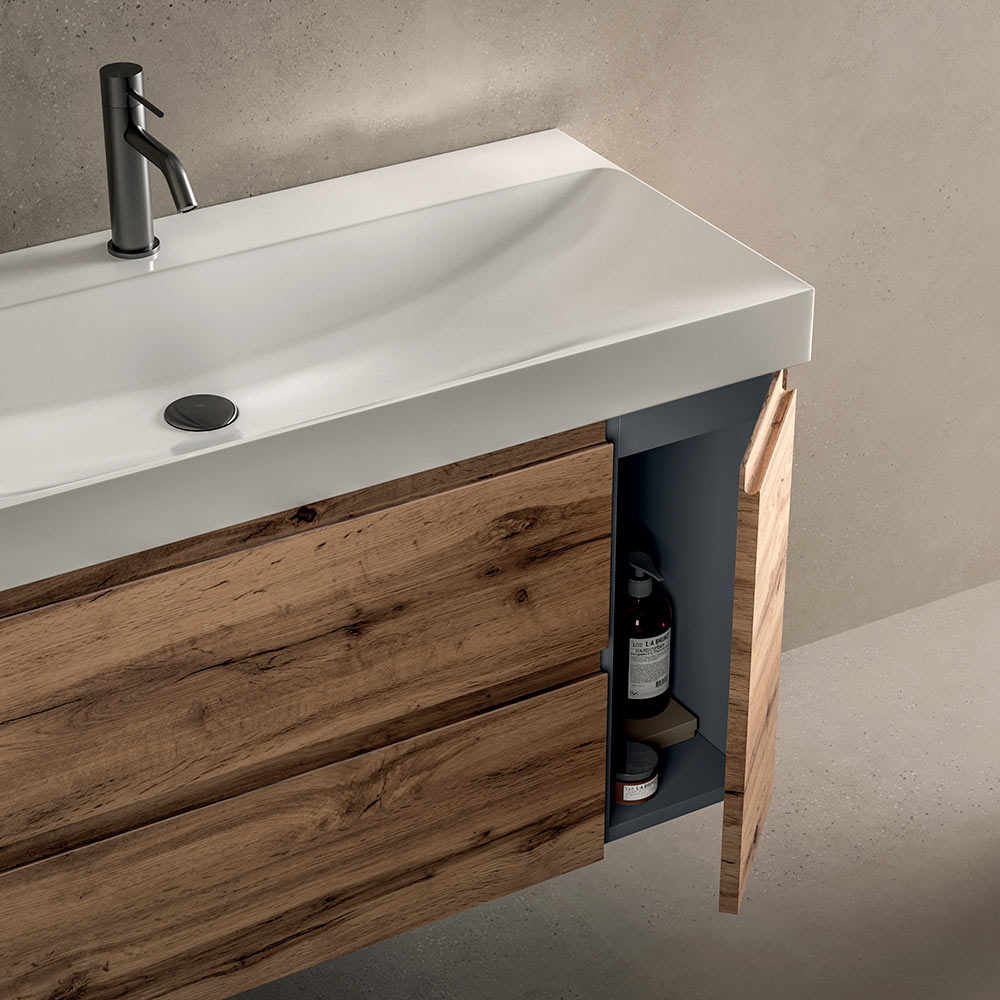 Szafka dolna z dwiema szufladami i bocznymi drzwiami oferuje funkcjonalne miejsce do przechowywania, zapewniając praktyczność na co dzień i estetyczny wygląd. Czyste linie i zawieszona konstrukcja optycznie rozjaśniają łazienkę.