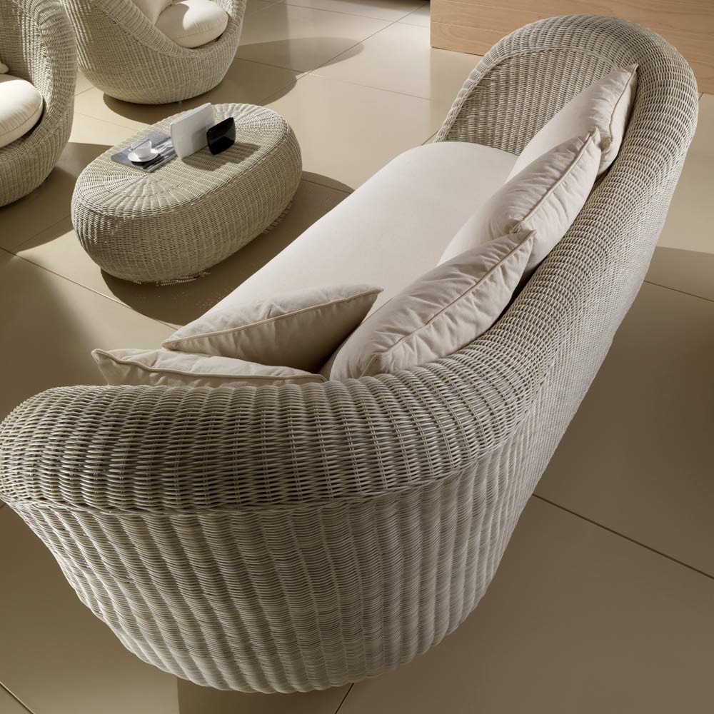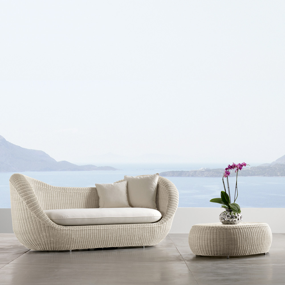 Ten salon zewnętrzny charakteryzuje się ciągłym i ponadczasowym designem, zaokrąglonymi liniami i wyrafinowaniem tkania ręcznie wykonanego przez najlepszych rzemieślników na świecie. z syntetycznej wikliny. Rama wykonana jest z malowanego proszkowo aluminium, na którym ręcznie tkane jest najwyższej jakości włókno Polyrattan marki Rehau.