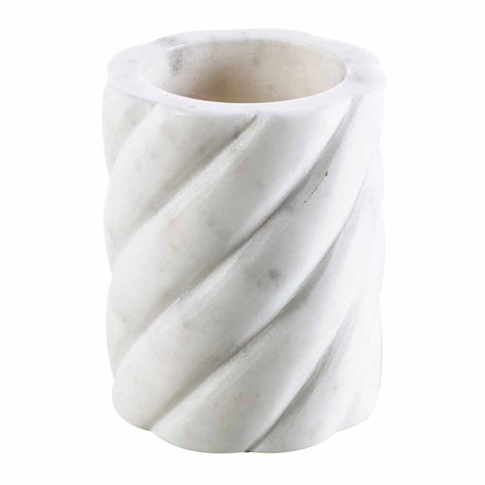 - akcesoria łazienkowe: dozownik o śr. 7,5x18cm, szkło śr.8x10cm, mydelniczka 10,5x2cm; wszystko ze skręconym wykonaniem z marmuru Calacatta.
