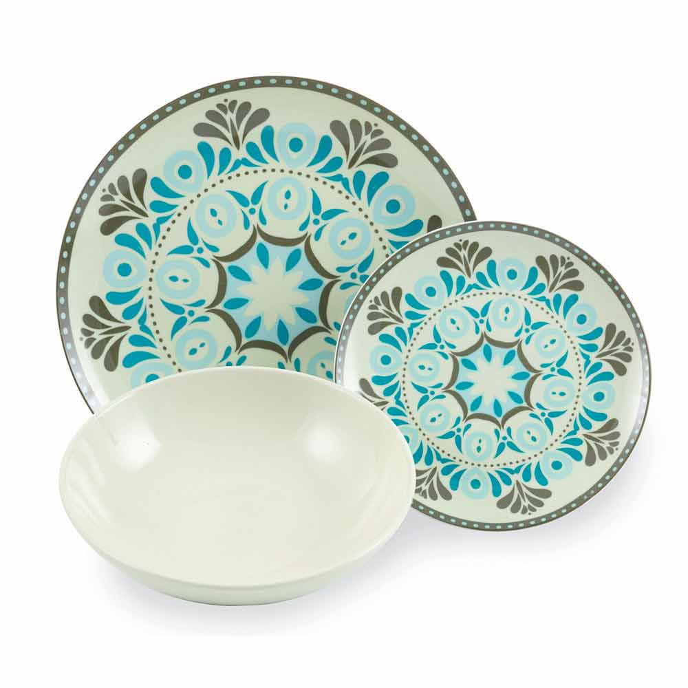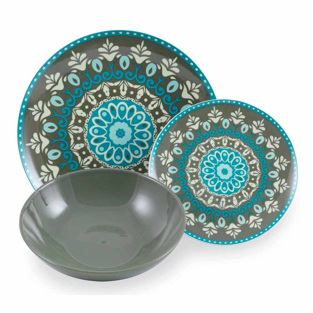 Zestaw obiadowy z porcelany i kolorowej kamionki, kompletny nowoczesny design 18 sztuk.