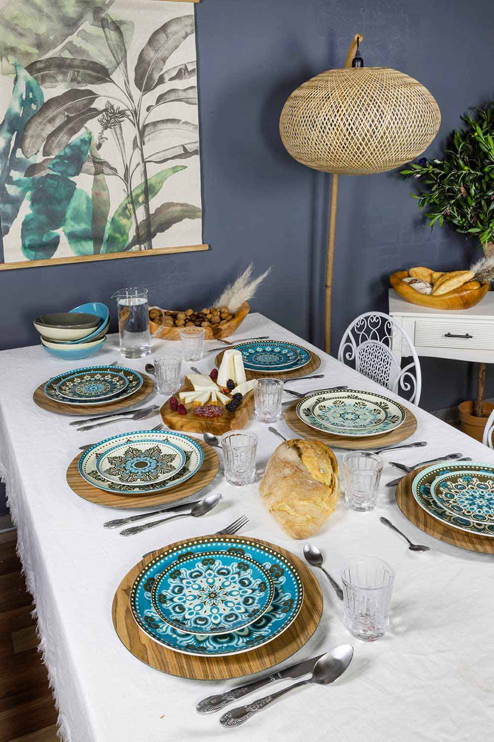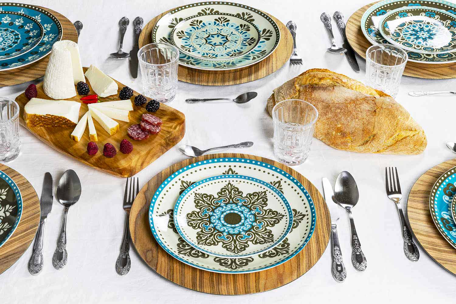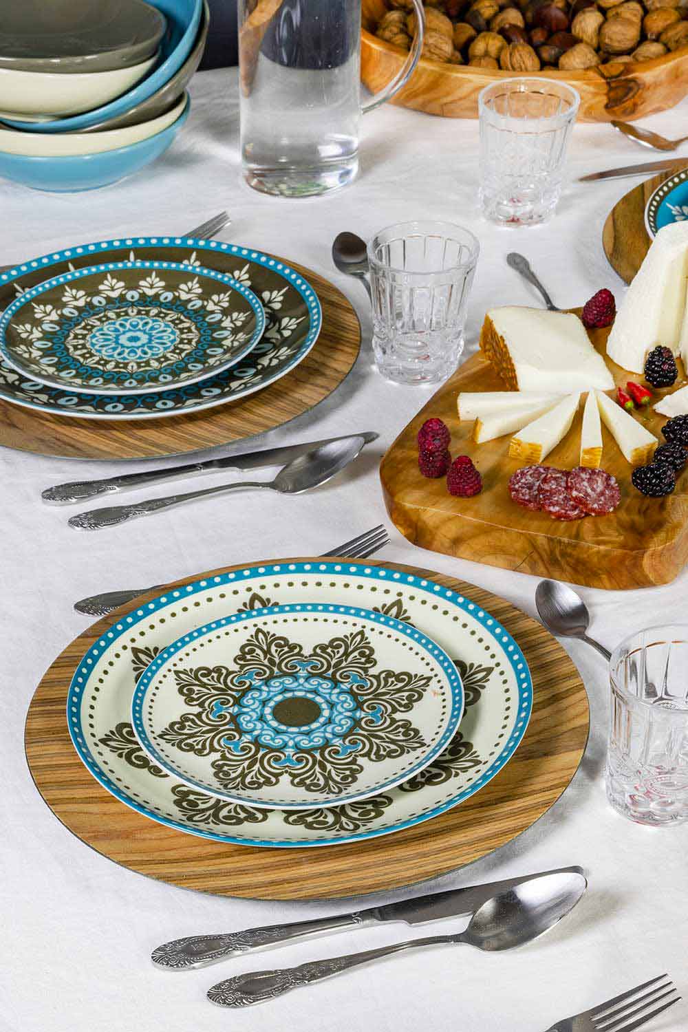 Elegancja i lekkość wyróżniają płaskie talerze i talerze owocowe, wykonane z cienkiej białej porcelany, na której naklejono naklejkę; z drugiej strony szkliwione kamionki sześciu talerzy do zupy zapewniają funkcjonalność stołu: