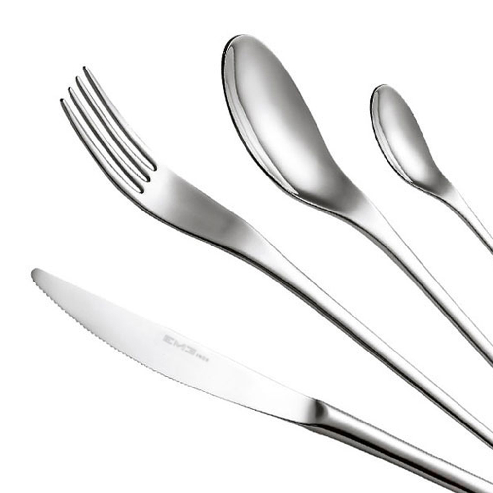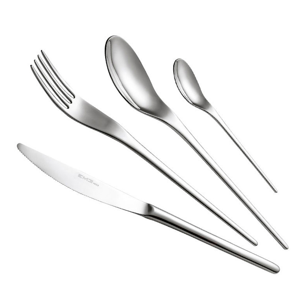 Komplet sztućców z polerowanej stali nierdzewnej, smukły design w orientalnym stylu, 24 sztuki wyprodukowany we Włoszech.