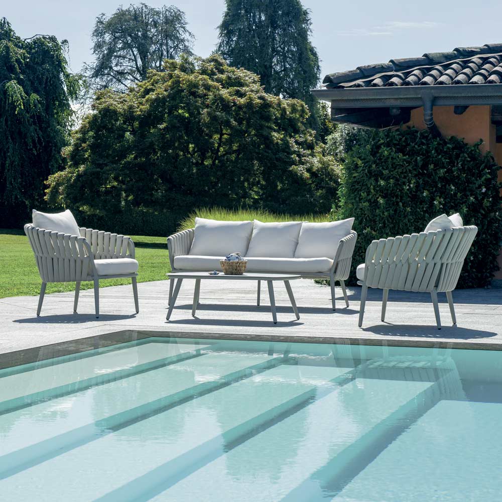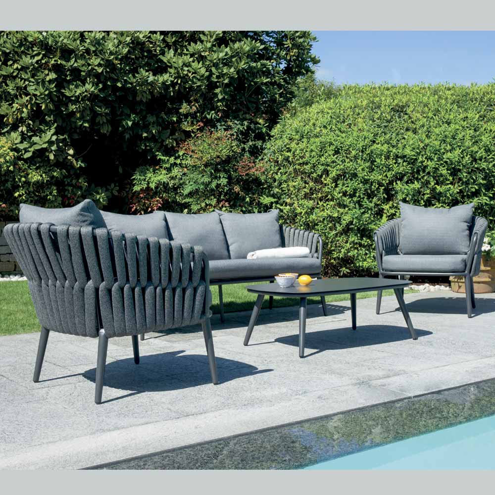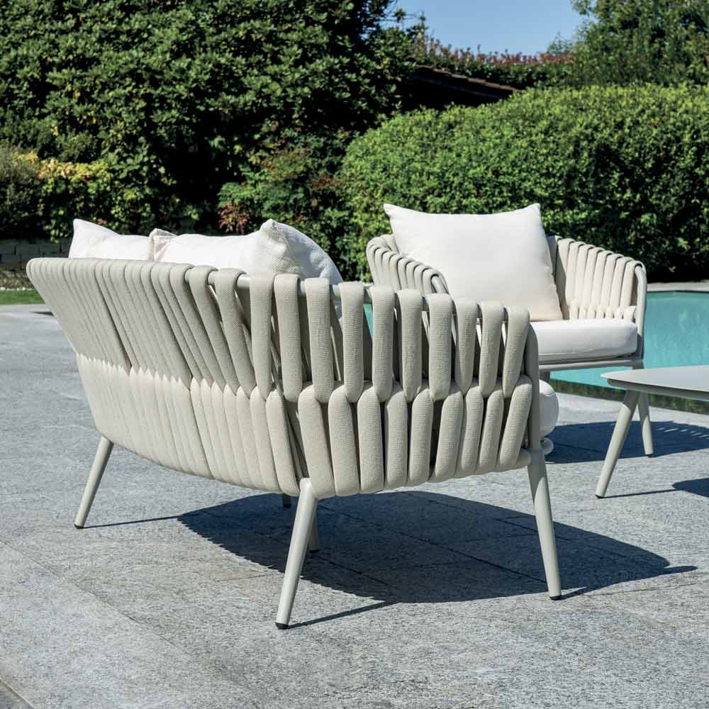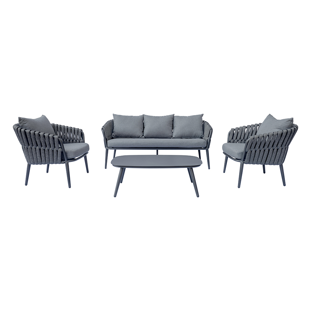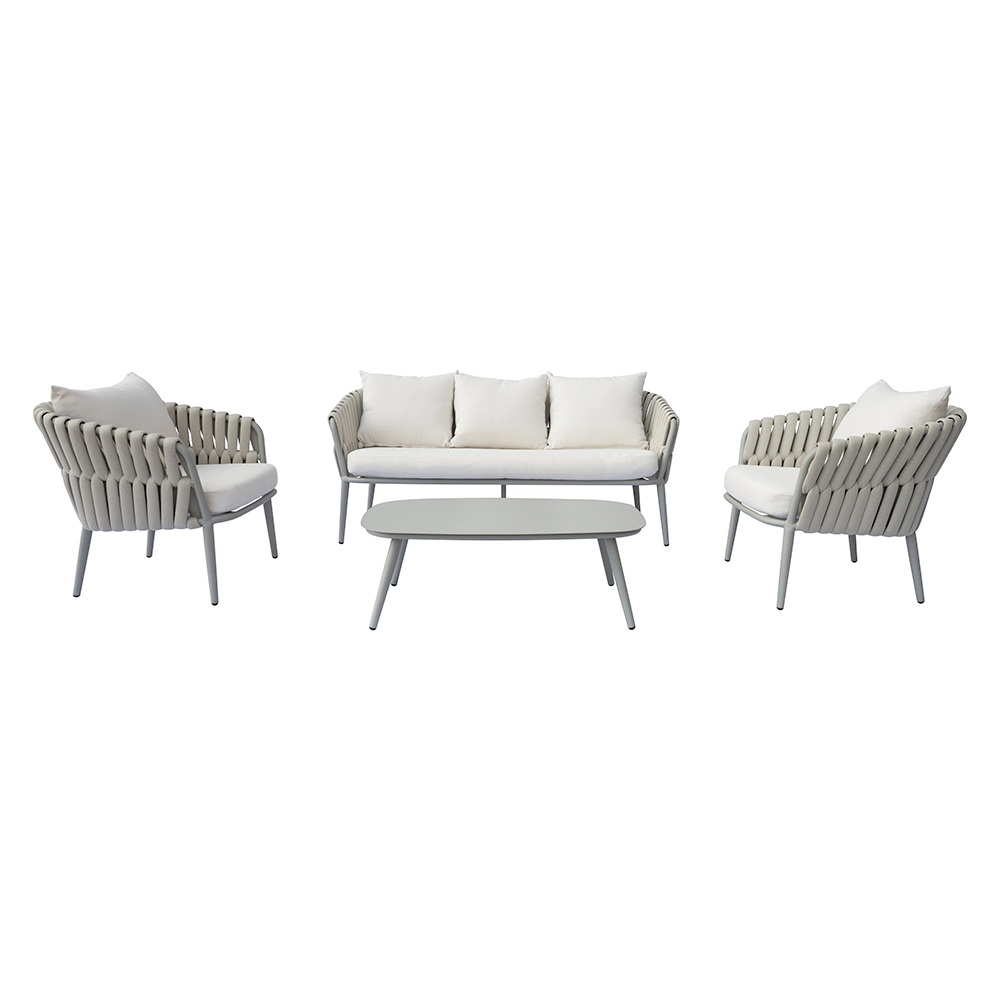 Aluminiowa rama zapewnia lekkość i trwałość, a miękka lina oplata siedziska i oparcia, nadając im nowoczesny, a zarazem wygodny charakter. Zdejmowane poszewki na poduszki są praktyczne i łatwe w czyszczeniu, zachowując elegancki i wyrafinowany wygląd salonu przez długi czas.