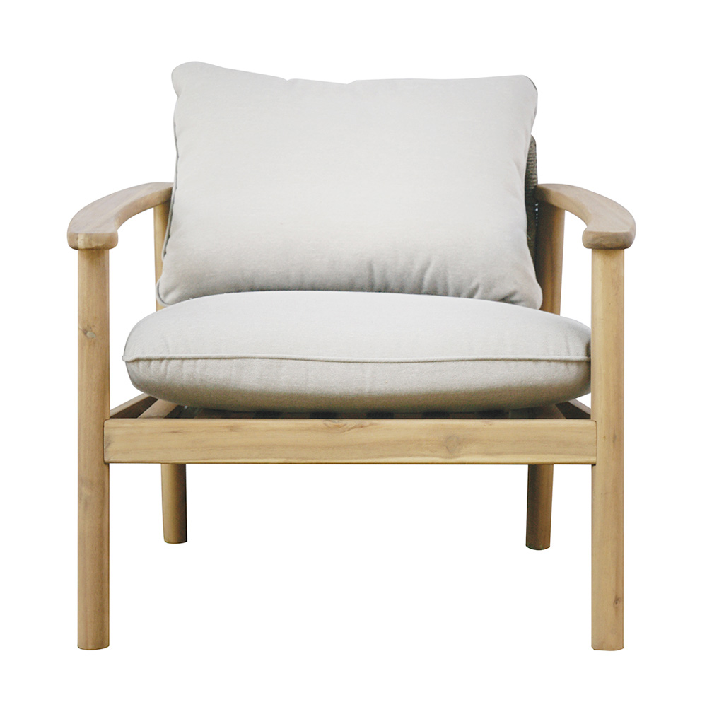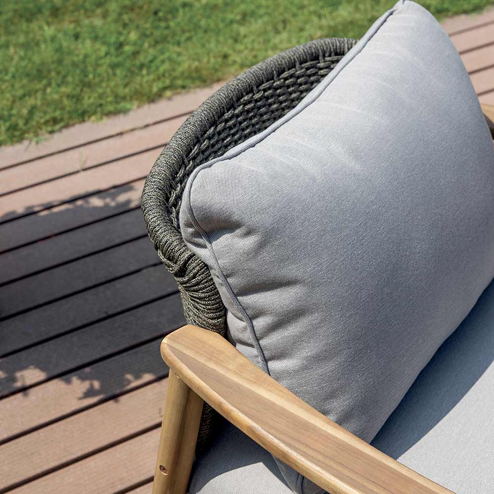 Rama z drewna akacjowego dodaje solidności i ciepła, a tkane antracytowe detale z liny dodają nowoczesnego i wyrafinowanego charakteru. Zdejmowane szare poduszki zapewniają najwyższy komfort i łatwą konserwację, zachowując elegancki i przytulny wygląd salonu przez długi czas.