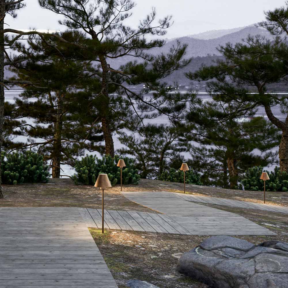 Kolekcja lamp zewnętrznych zrodziła się z chęci przeniesienia cech wyposażenia wnętrz do produktów przeznaczonych na zewnątrz, aby stworzyć przyjazną i rodzinną atmosferę nawet na świeżym powietrzu. Dzięki liniom inspirowanym nordycką estetyką lampy podłogowe lub ścienne wykonane są z mosiądzu i miedzi.