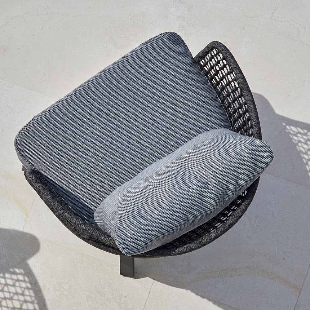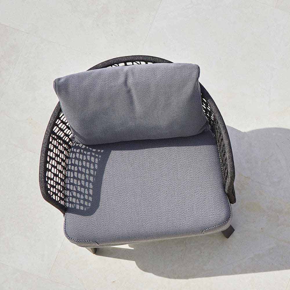 Emma to wspaniały fotel zewnętrzny ze strukturą z ręcznie tkanego włókna syntetycznego z ciemnoszarą ramą z proszkowego aluminium.