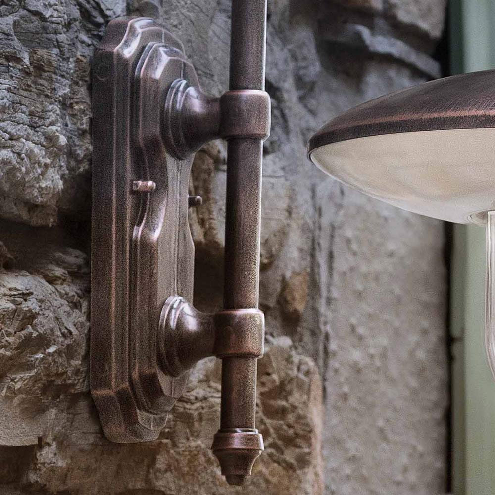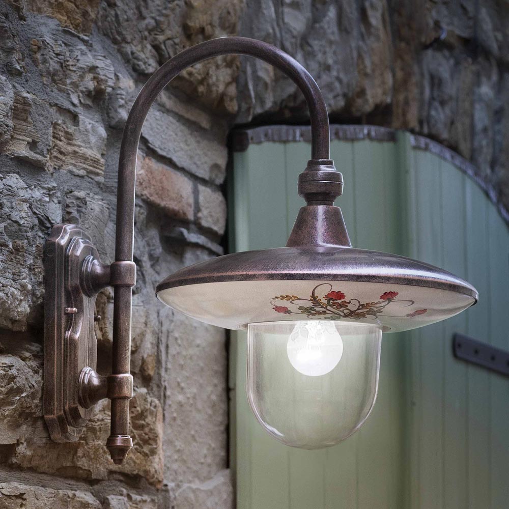 Ta zewnętrzna lampa ścienna jest w całości wykonana z czarnego aluminium z miedzianym kloszem i ozdobiona ręcznie malowanymi kwiatami dla klasycznego i harmonijnego stylu pomiędzy kształtem a kolorami.