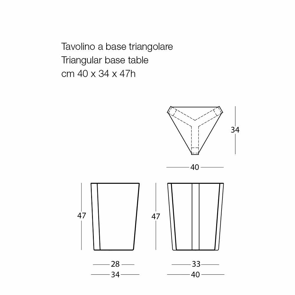 Ten stolik kawowy na zewnątrz charakteryzuje się oryginalnym i nowoczesnym trójkątnym designem, a dzięki zasadniczym liniom może być używany samodzielnie lub w połączeniu z innymi podobnymi, aby tworzyć różne kształty i konstrukcje z większą przestrzenią podparcia. W całości wykonany z metalu dzięki obróbce kataforezą przed malowaniem proszkowym jest szczególnie odporny na działanie czynników atmosferycznych. Grubość blatu 3 mm.
