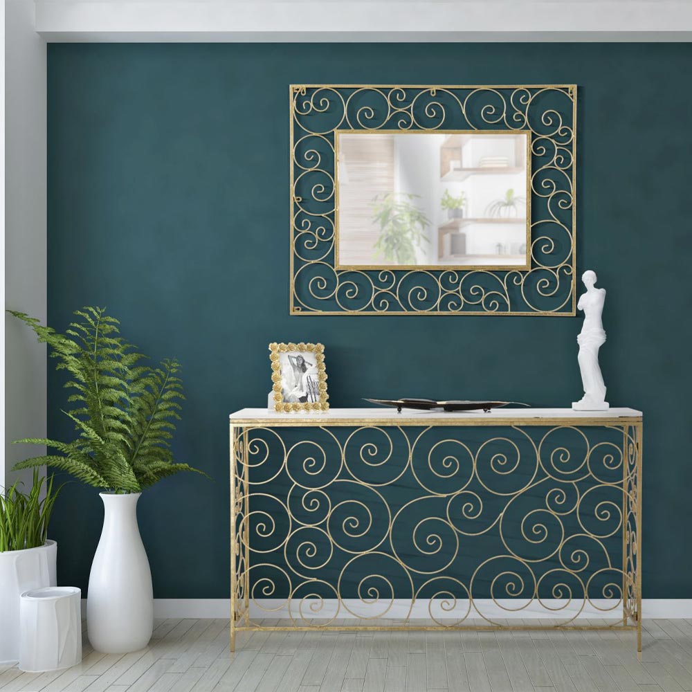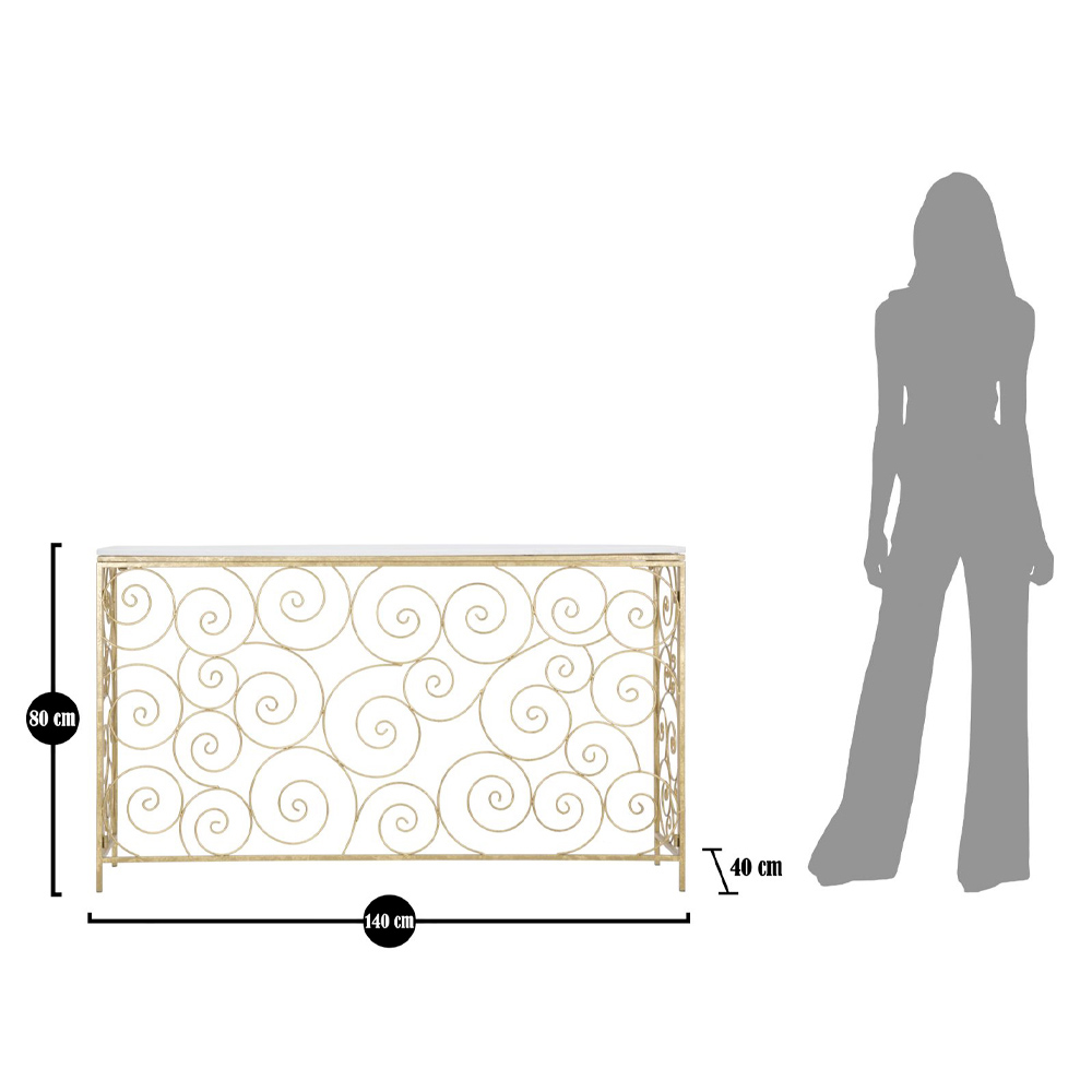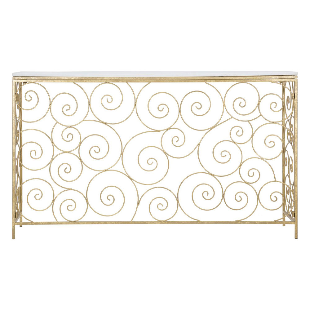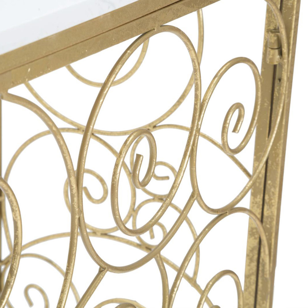 Konsola wejściowa z żelaza i białego marmuru w złotym wykończeniu.