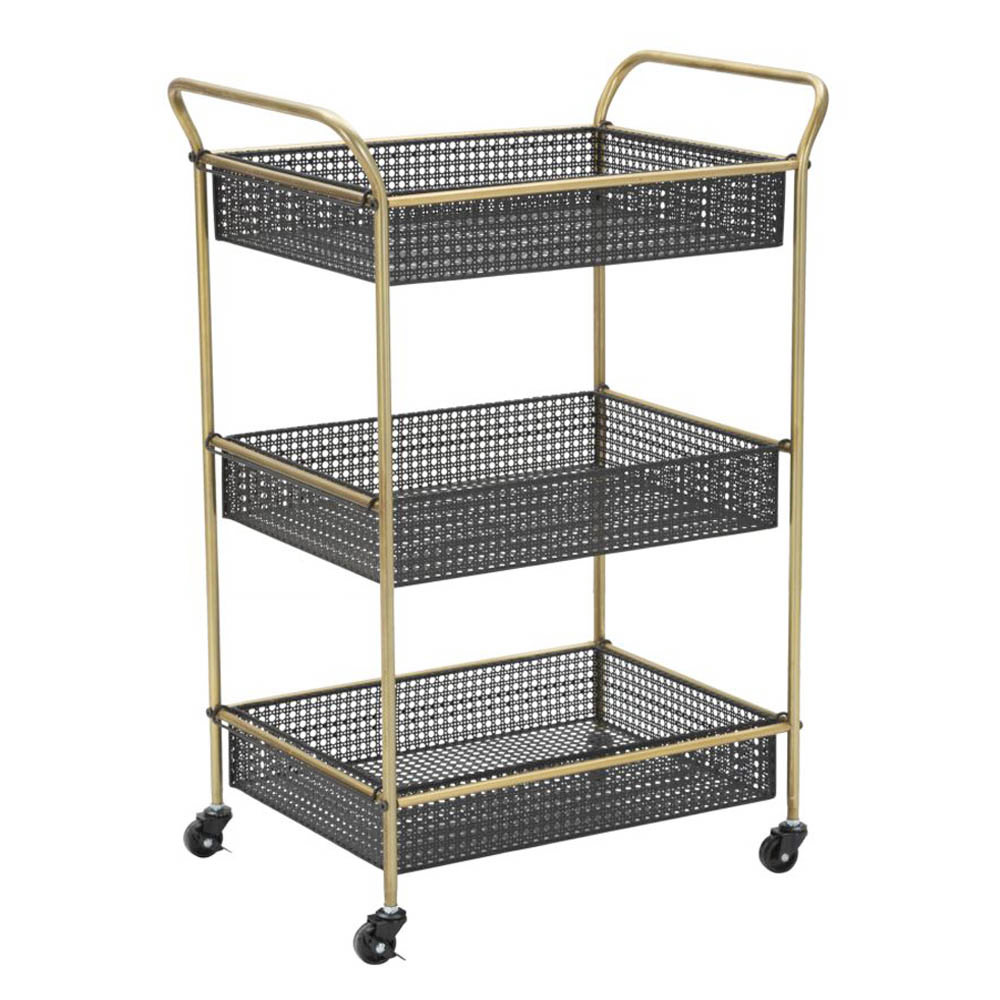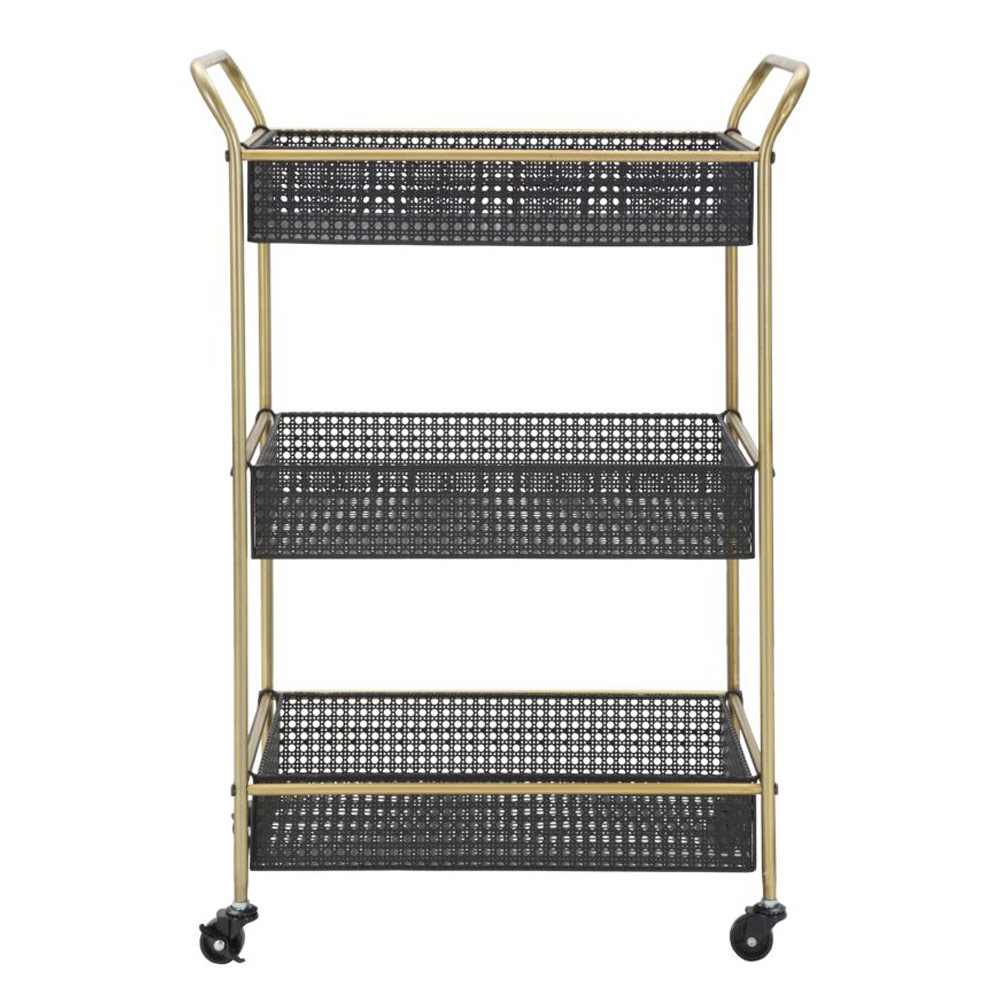 Wózek spożywczy wykonany z żelaza o złotym wykończeniu konstrukcji wyposażony w 3 półki i wyposażony w kółka. Uniwersalna, nowoczesna i funkcjonalna konstrukcja idealna do domowych przestrzeni, takich jak jadalnie czy kuchnie, gdzie stanowi praktyczne i użyteczne uzupełnienie, a jednocześnie doskonale nadaje się do uzupełnienia mebli z odrobiną zniewalającej osobowości .