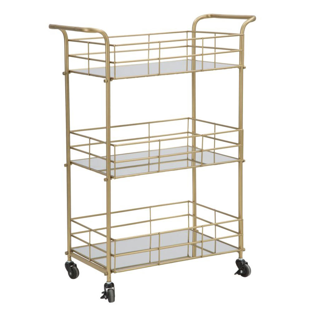 Wózek spożywczy z pozłacanego żelaza z lustrzanymi półkami i kółkami.