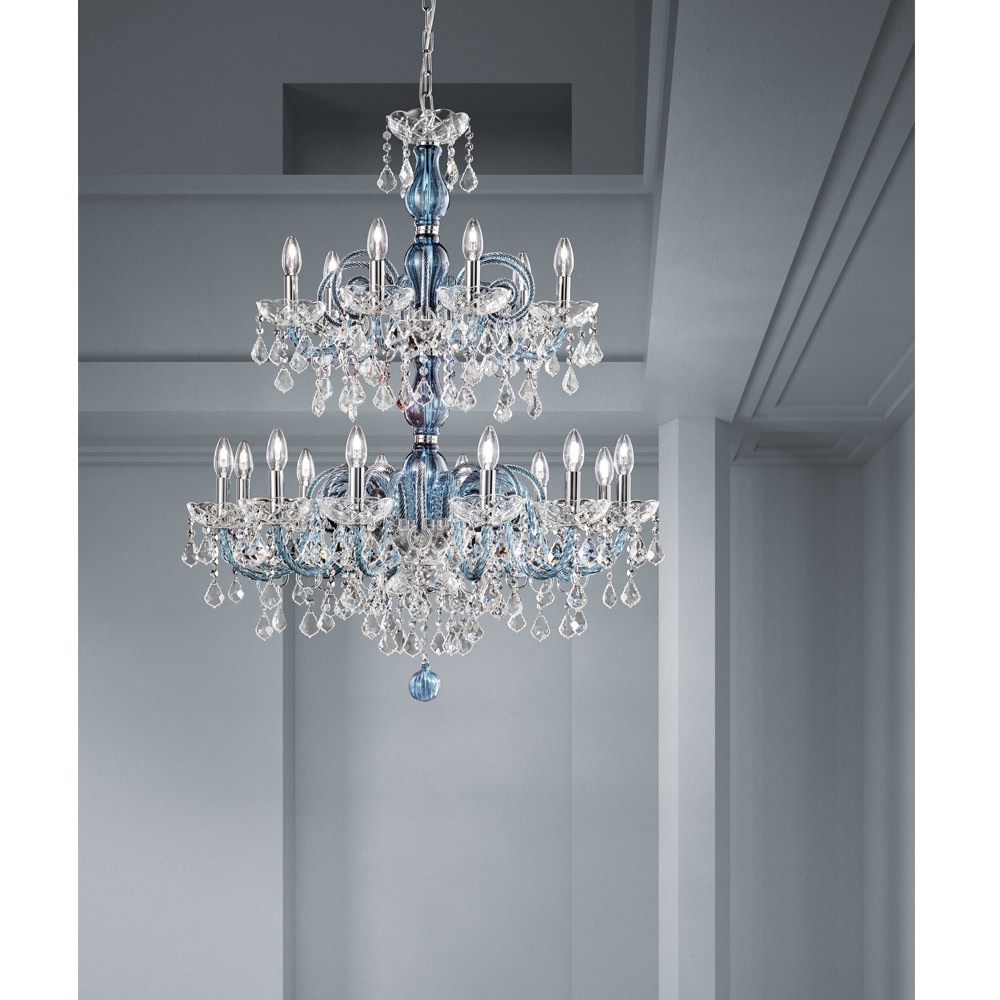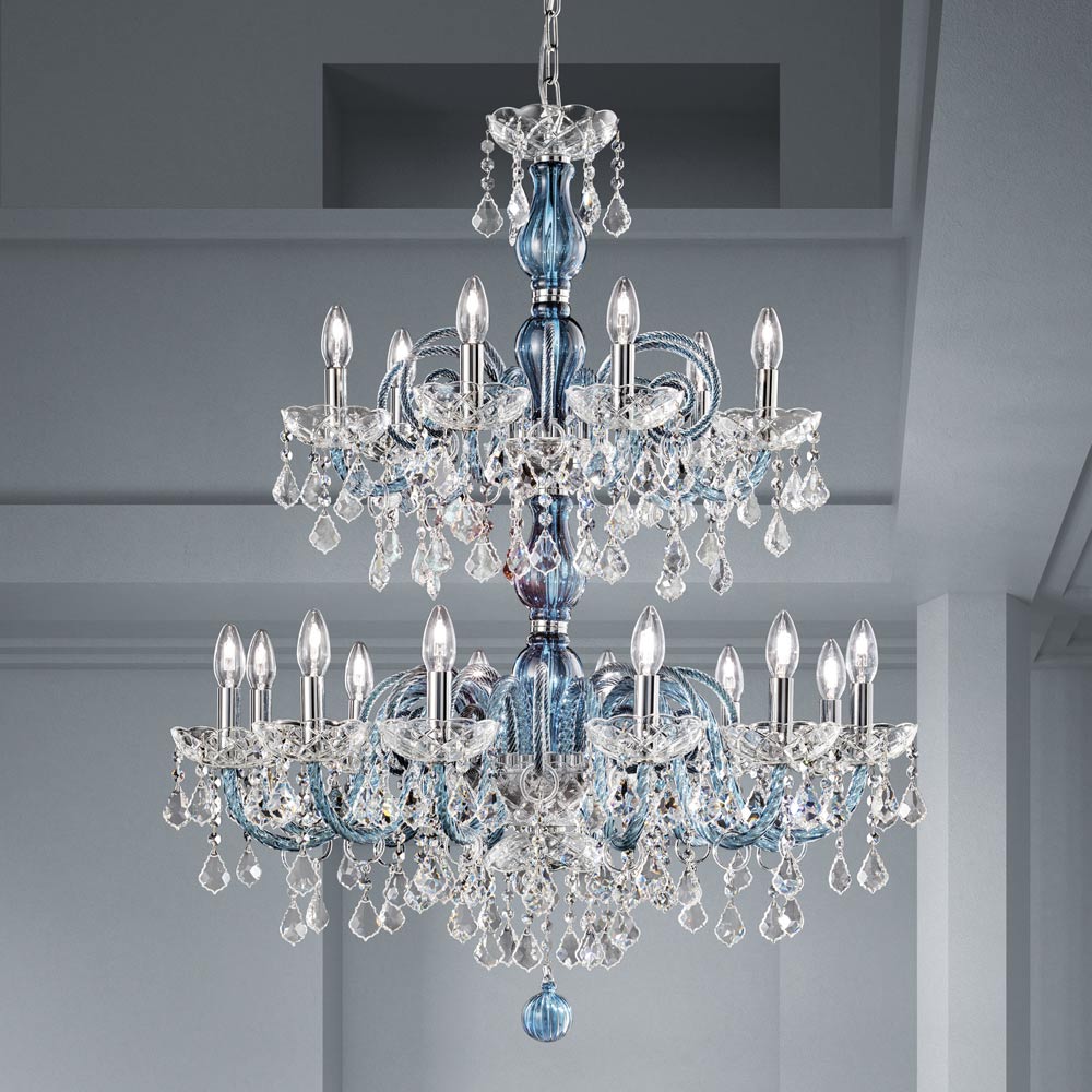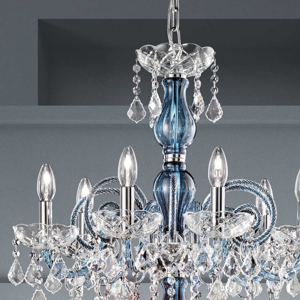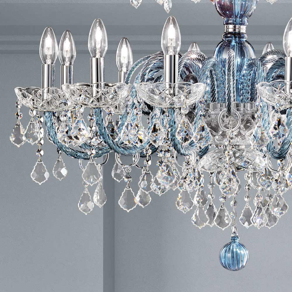 18-punktowy żyrandol ze szkła weneckiego w wykończeniu dżinsowym z ołowianymi wisiorkami i polerowanym chromowanym metalem . Wykonany z kunsztu , ten dodatek charakteryzuje się wspaniałymi ramionami, które są wykonywane ręcznie techniką skręcania, co tworzy ekskluzywny efekt, który estetycznie przypomina splot liny, nadając żyrandolowi osobowość. Prawdziwy deszcz światła wdziera się w strukturę żyrandola, a następnie rozchodzi się po otoczeniu poprzez załamanie magii cekinów i kryształowych wisiorków z delikatnymi wykończeniami, tworząc w ten sposób sugestywny i zjawiskowy efekt scenograficzny, który jest czarujący i zaskakujący. za elegancję i majestat .