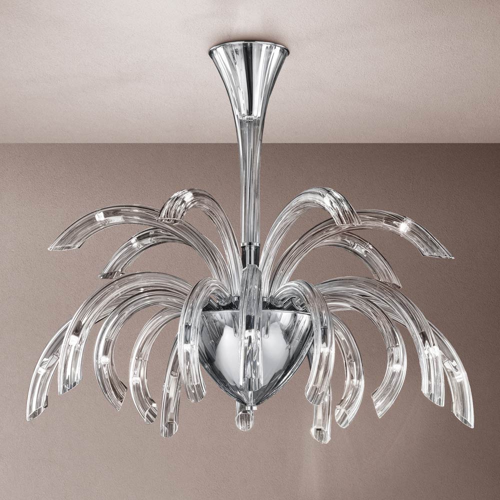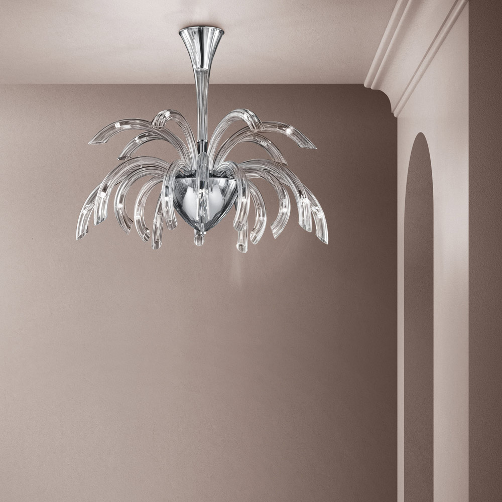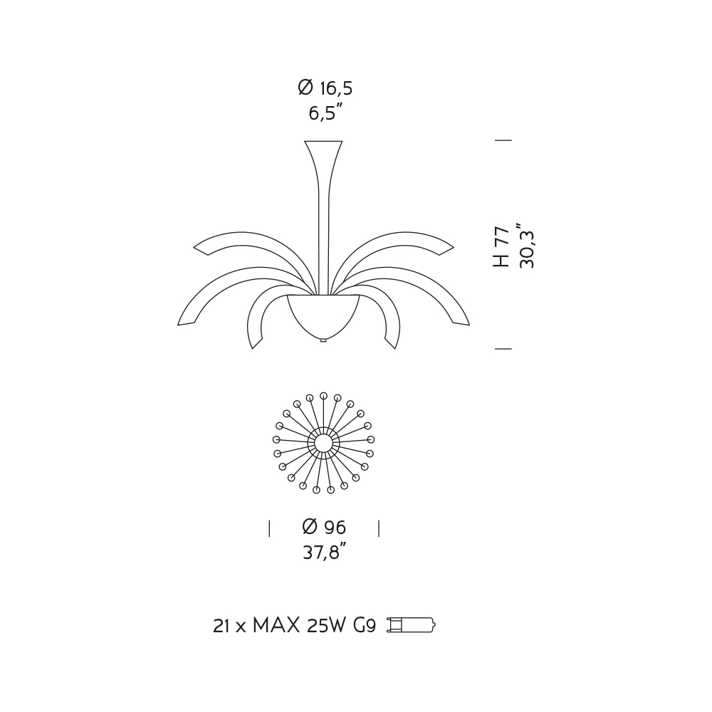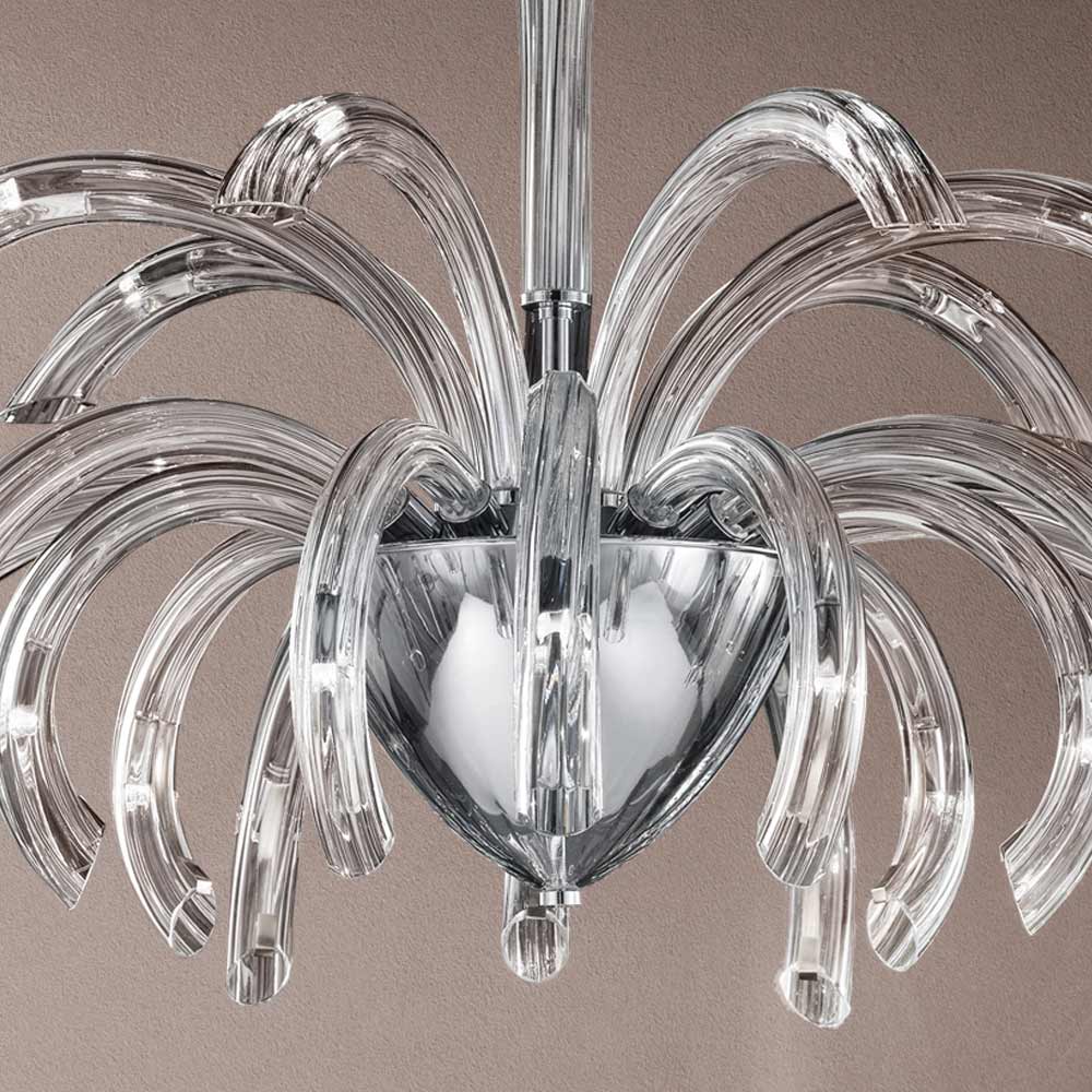 Żyrandol z 21 lampkami wykonany z ręcznie wytwarzanego szkła weneckiego z kryształowym wykończeniem i wzbogacony detalami z chromowanego metalu . Wciągająca estetyka, która dopasowuje się do każdego rodzaju otoczenia, w którym pasuje z żywiołowością dzięki swoim kształtom i funkcjonalności projektu. Wspaniałe i eleganckie zakrzywione ramiona rozszerzają się na zewnątrz, wnosząc światło w różnych kierunkach i oświetlają pomieszczenie dzięki oryginalnemu efektowi scenograficznemu, który przypomina eksplozję fajerwerków, zapewniając kreatywny , wyrafinowany i silny efekt wizualny .