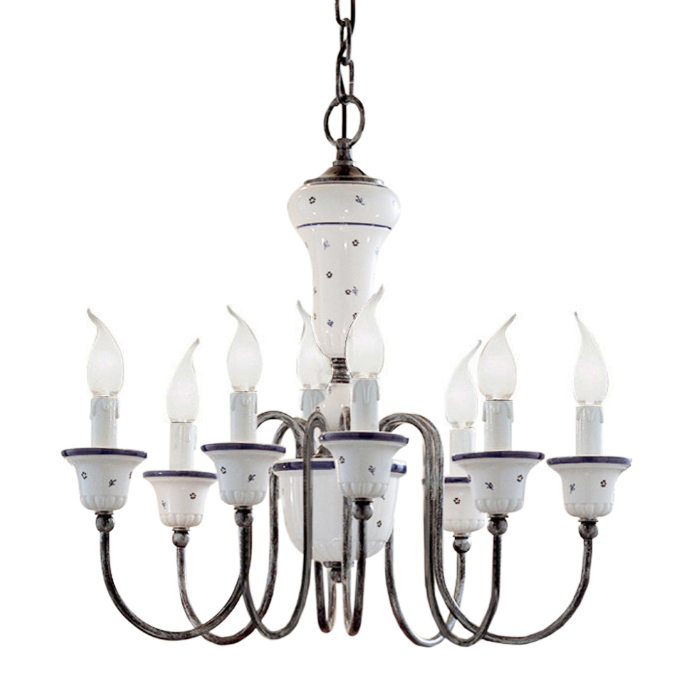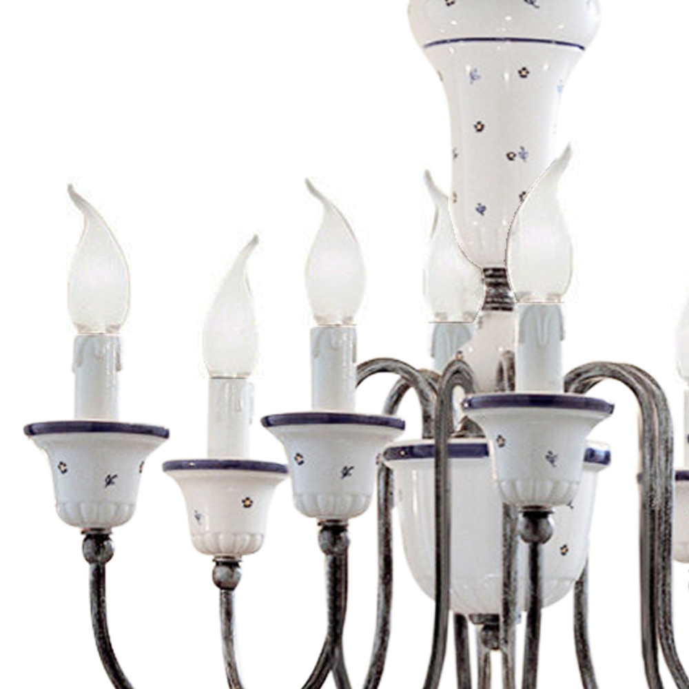 Ręcznie wykonany 8-lampowy żyrandol z mosiądzu i ręcznie malowany ceramiczny żyrandol wyprodukowany we Włoszech przez Ferroluce.