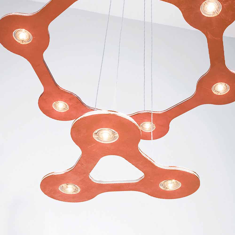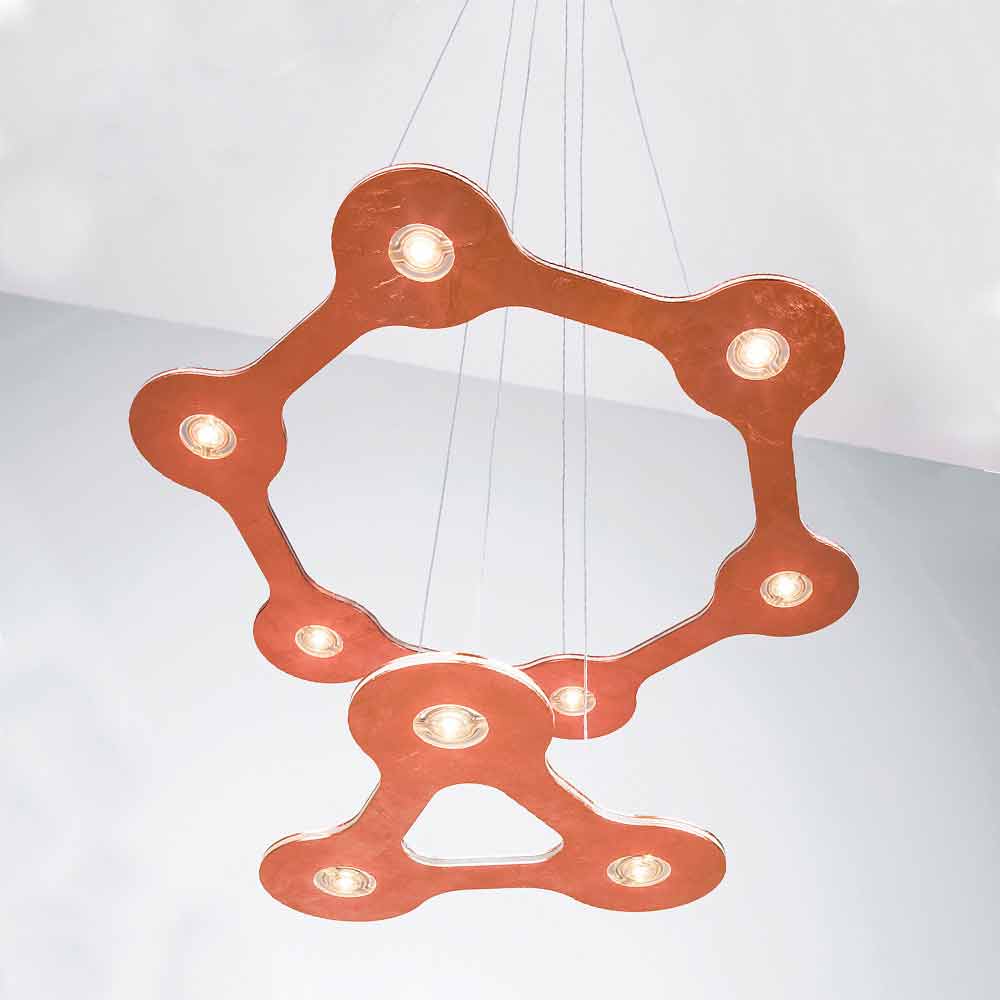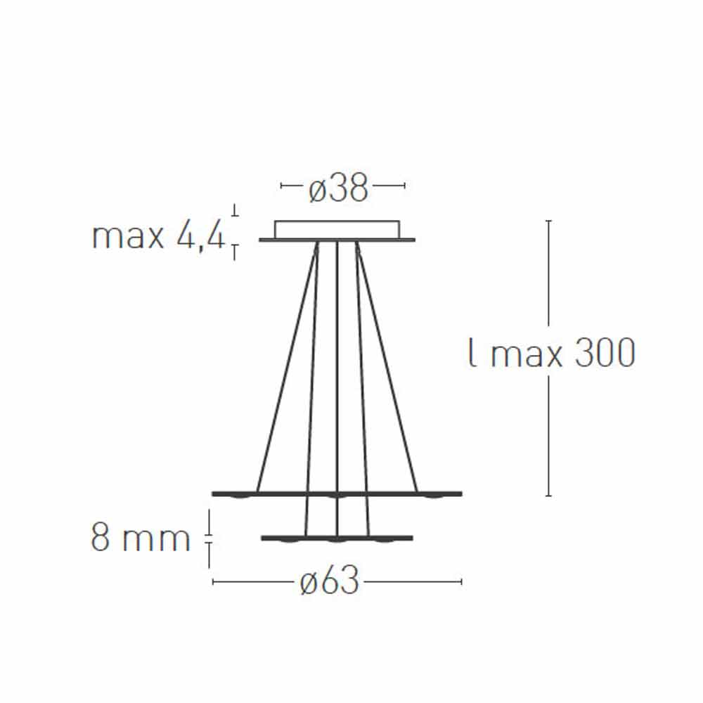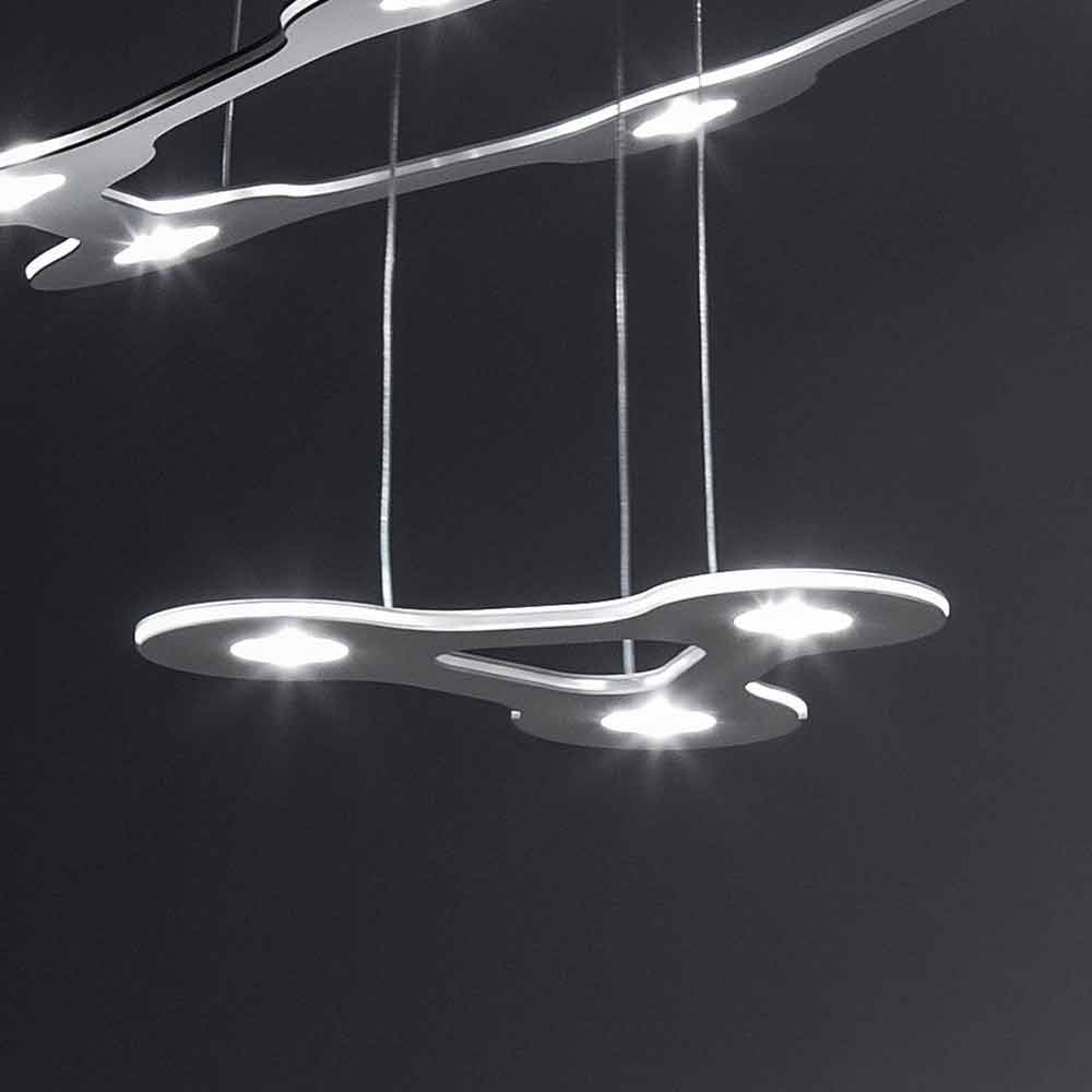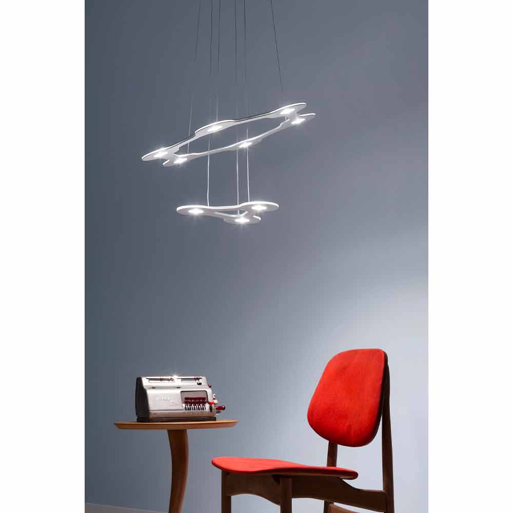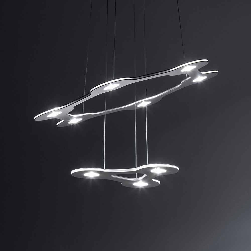 Żyrandol 9 świateł wyprodukowany we Włoszech o konstrukcji aluminiowo-metakrylowej i kloszach z poliwęglanu w komplecie z przezroczystym przewodem 300 cm i elektronicznym zasilaczem z możliwością ściemniania w zestawie (brak ściemniacza). System oświetleniowy, który minimalizuje powierzchnię i objętość korpusu żyrandola, aby uzyskać znaczące korzyści w zakresie optymalizacji przestrzeni i lekkości. Zastosowane innowacyjne i funkcjonalne źródło LED zapewnia bezpośrednie światło skierowane w dół, podczas gdy poziom metakrylanu pozwala na delikatne rozproszenie go w całym otoczeniu, zapewniając optymalny efekt . Jego wielopoziomowa struktura reprezentuje prawdziwą osobliwość tego ekscentrycznego i oryginalnego żyrandola zaprojektowanego w celu zapewnienia wysokiej jakości źródła światła w dużych przestrzeniach, takich jak jadalnie, kuchnie lub salony o współczesnej estetyce, w której konieczne jest uzupełnienie stylu o wyjątkowy i wyrafinowany dotyk .