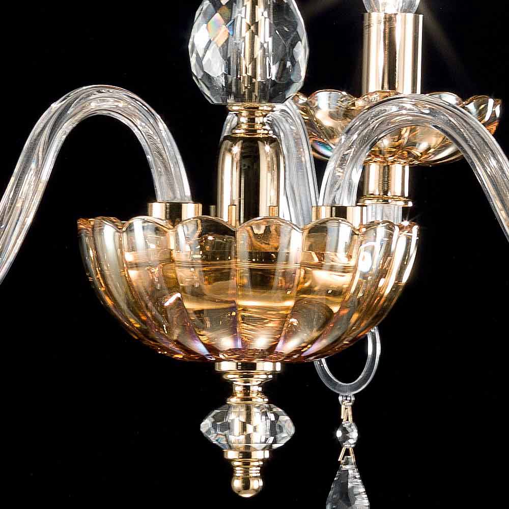 Lampa wisząca z bursztynowego szkła i kryształu ze złotym wykończeniem.