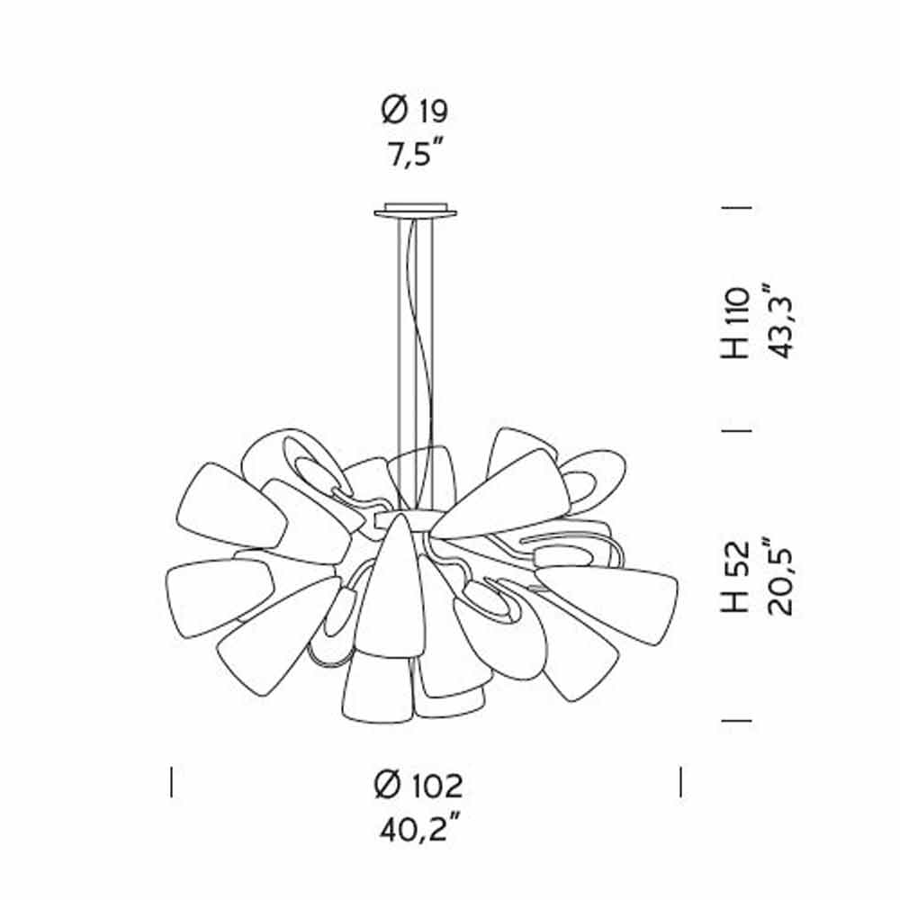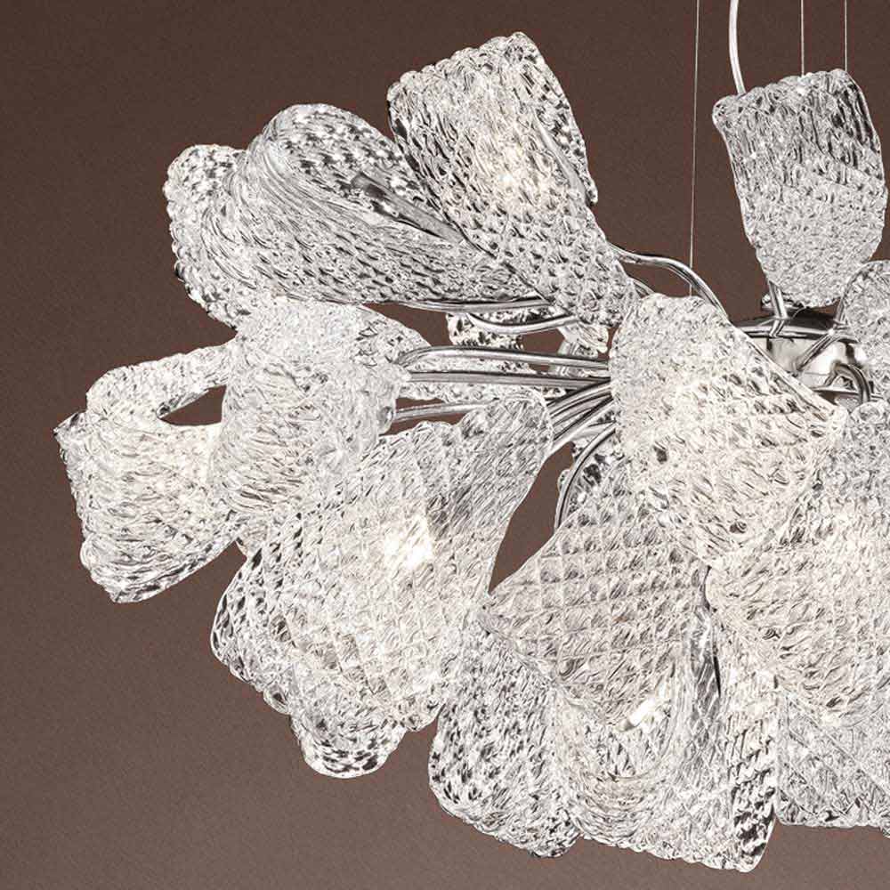 Imponujący i wyrafinowany 21- punktowy żyrandol wykonany ręcznie we Włoszech z kryształowo wykończonego szkła weneckiego z detalami i wstawkami z polerowanego chromowanego metalu . Ze spotkania krzywych linii i obszernych kształtów rodzi się niezwykle wyrafinowany dodatek oświetleniowy , charakteryzujący się dużymi szklanymi kokardami, które podnoszą jego wartość i wzbogacają jego estetykę. Znajdziemy na nich wzór rombu uzyskany poprzez nadrukowanie faktury na szkle na gorąco i w ten sposób umożliwienie prześlizgiwania się światła pomiędzy rowkami, odbijając się na metalowych elementach dla spektakularnej gry refleksów .
