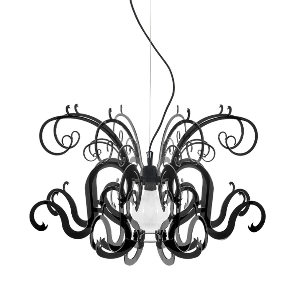 Lampa wisząca z czarnego lub białego pleksi, która nadaje się do recyklingu, wyprodukowana we Włoszech.