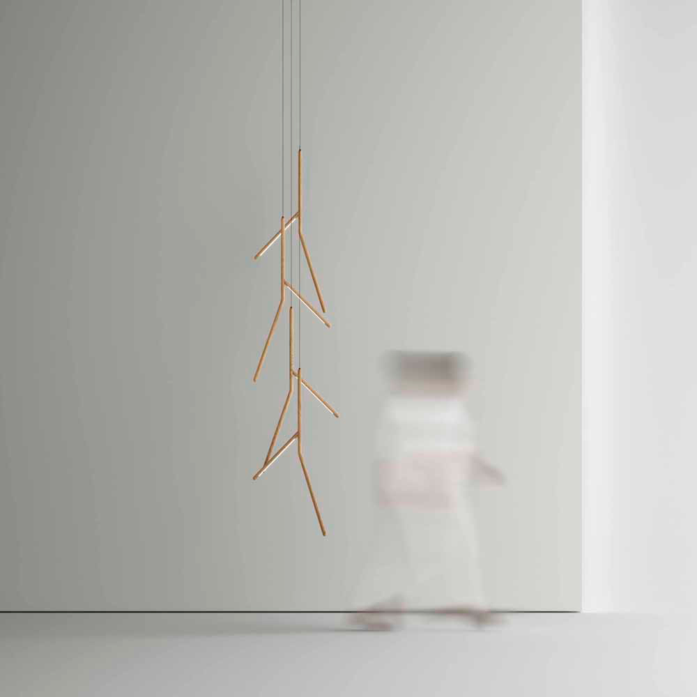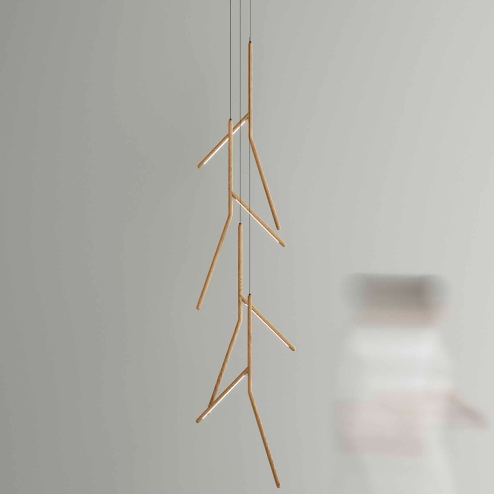 Ten żyrandol łączy kunszt wykonania z litego drewna z technologią oświetleniową. Delikatny znak graficzny zostaje podkreślony w instalacjach z wieloma lampami, stając się absolutnym bohaterem otoczenia.