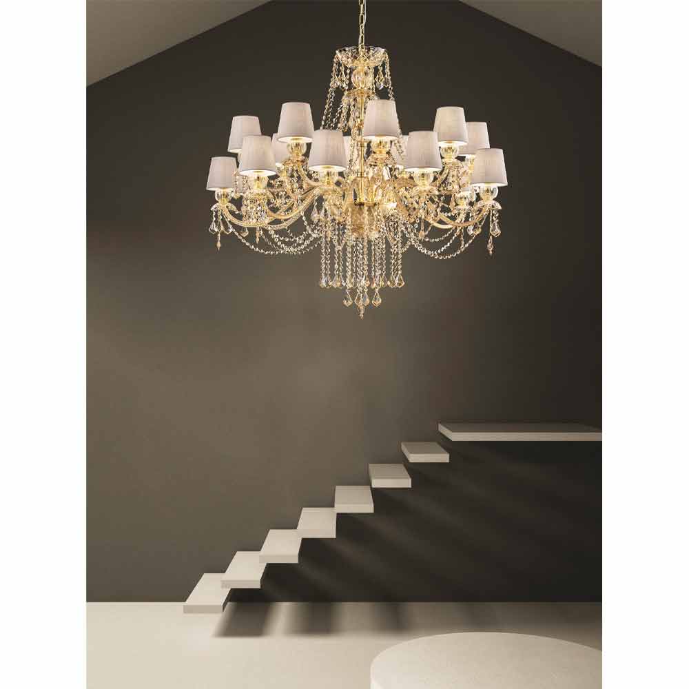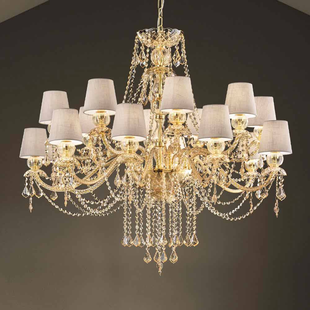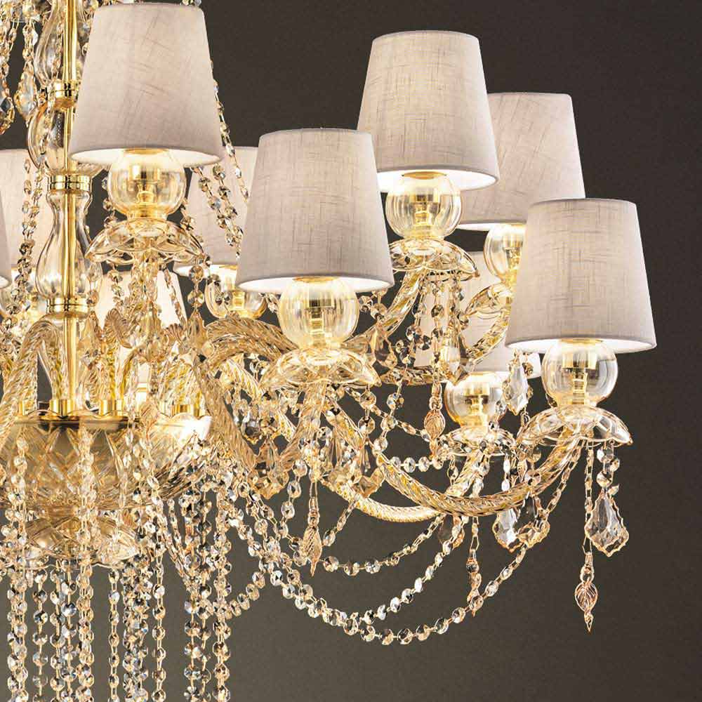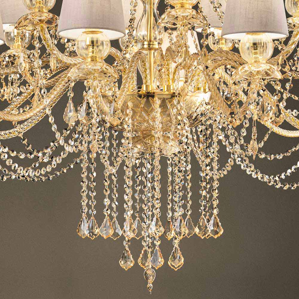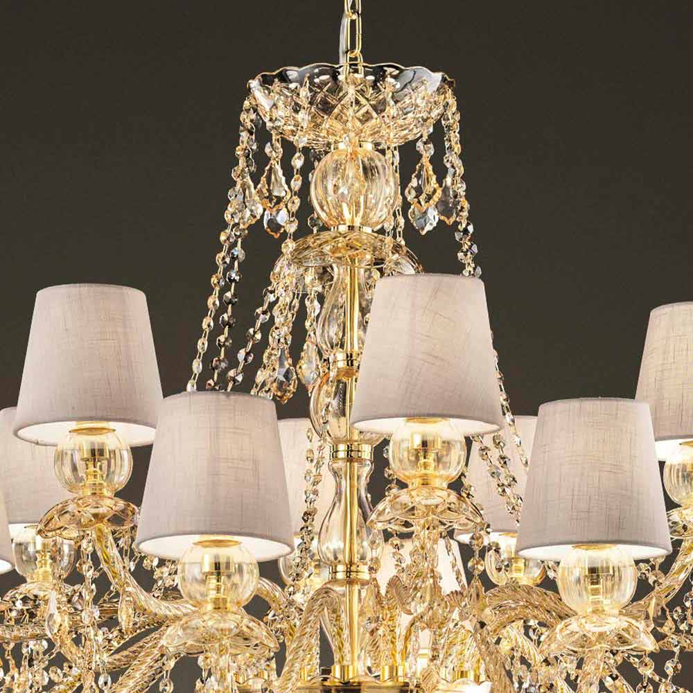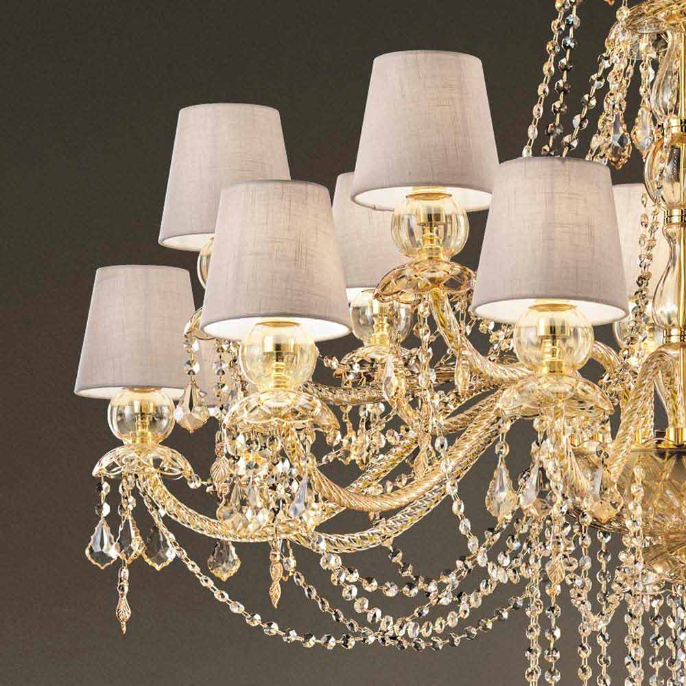 Wyrafinowany żyrandol z bursztynowym wykończeniem Struktura ze szkła weneckiego wzbogacona elementami w wykończeniu kryształu, 16 lnianych abażurów i błyszczącymi złotymi metalowymi detalami, ręcznie robiony we Włoszech . Świetliste wisiorki i fascynujące abażury reprezentują osobliwości tego wspaniałego akcesorium meblowego o romantycznej duszy, zdolnej nadać dużym pomieszczeniom osobowość i styl z ponadczasową elegancją . Jego estetyka jest wyjątkowa i interesująca dzięki licznym cekinom, które poprzez załamanie światła tworzą kolorowe wiązki światła oraz wyrafinowaną grę światła i cienia dla żyrandola o silnym oddziaływaniu scenograficznym .