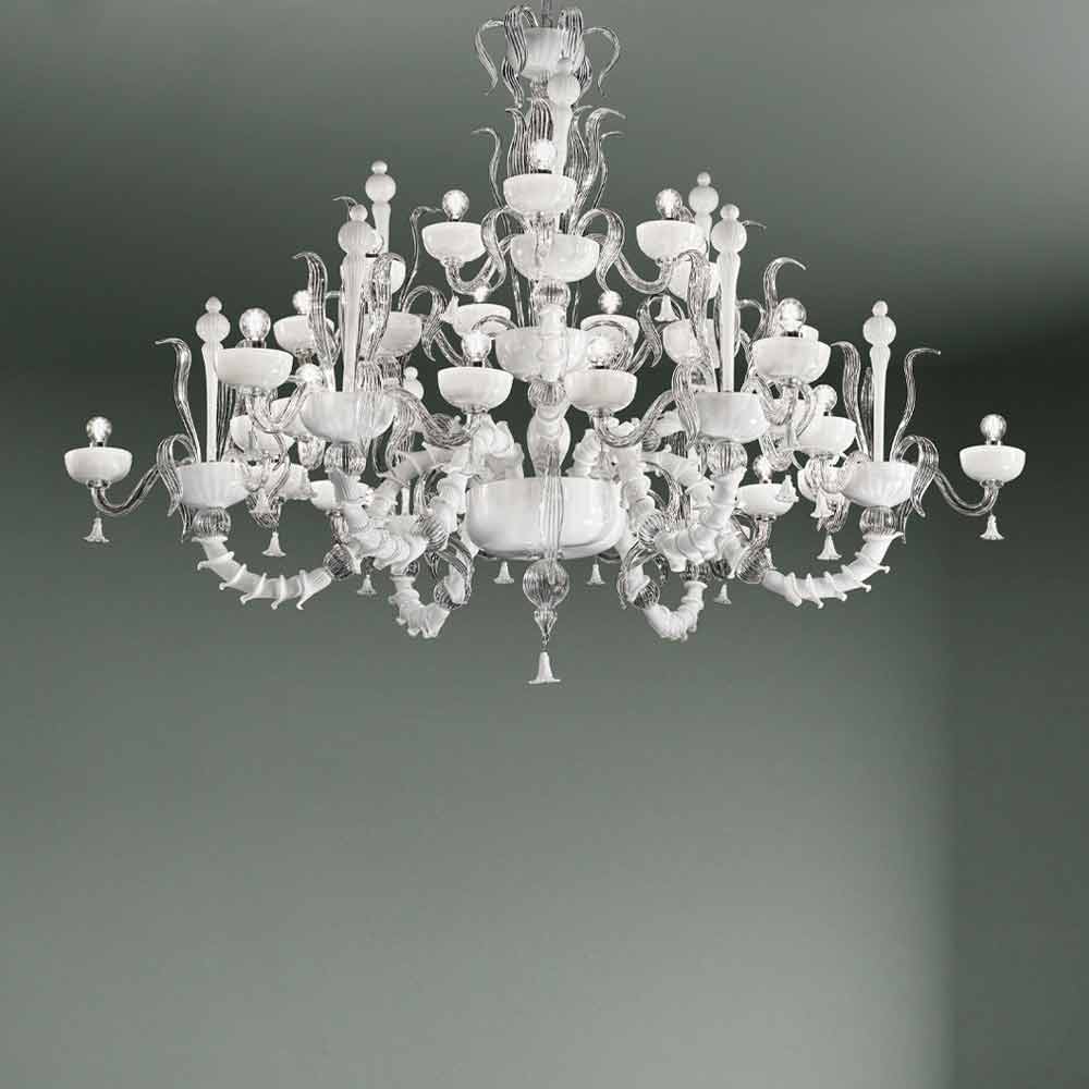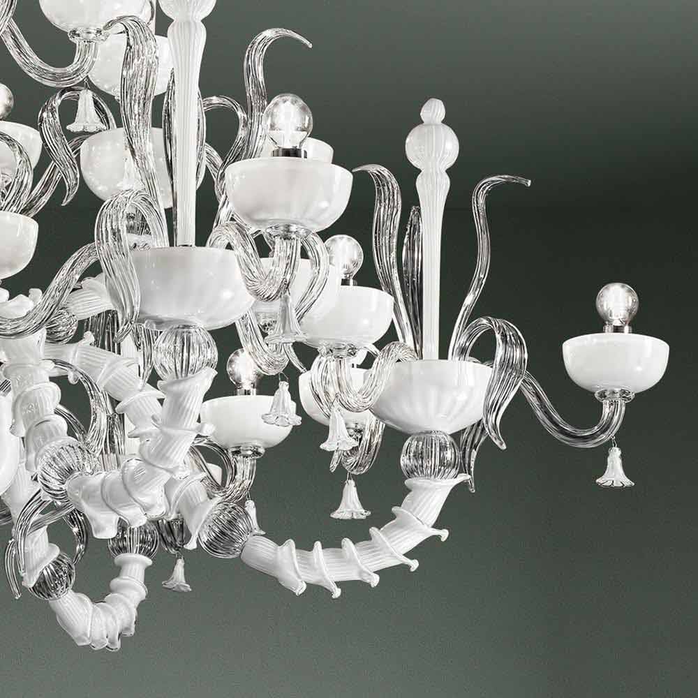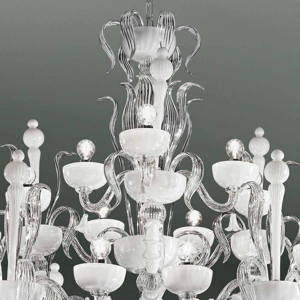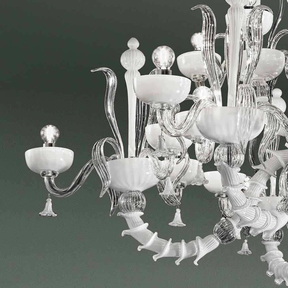 Majestatyczny żyrandol o klasycznych liniach wykonany ręcznie w Wenecji z kryształu i mlecznobiałego szkła z detalami z polerowanego chromowanego metalu . Ten wspaniały mebel zrodził się z zastosowania prastarej techniki poszycia, której estetyka opiera się na koncepcjach innowacyjności i jednocześnie przywoływania przeszłości . Idealny do oświetlania dużych przestrzeni w domu, ten żyrandol wyróżnia się futurystyczną estetyką dzięki wspaniałemu mlecznobiałemu wykończeniu, które pokrywa strukturę. Projekt wzbogacają również zwężające się ramiona ozdobione wiszącymi dzwoneczkami w całości ukształtowanymi ręcznie, co zapewnia wysoką jakość i nieocenioną wartość .
