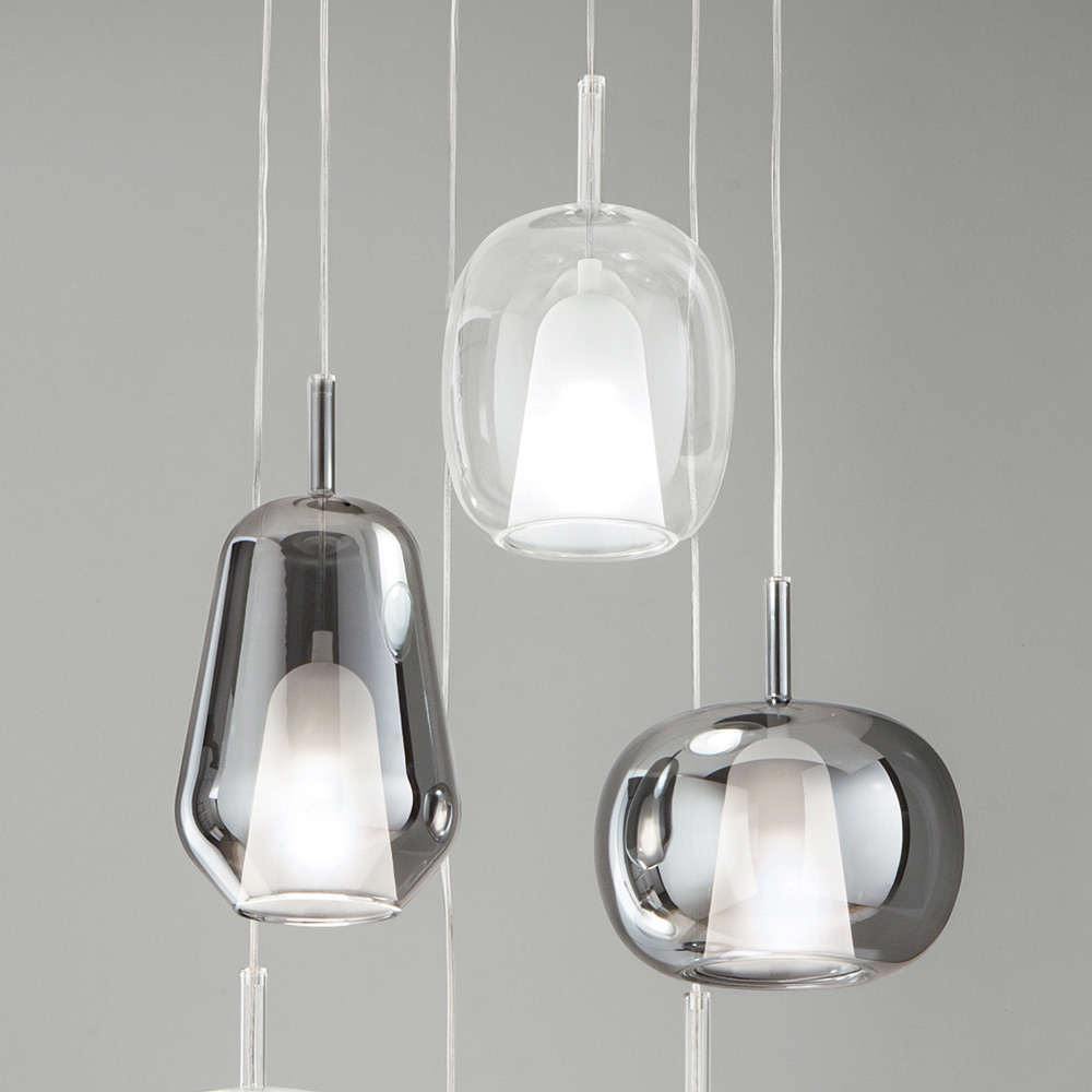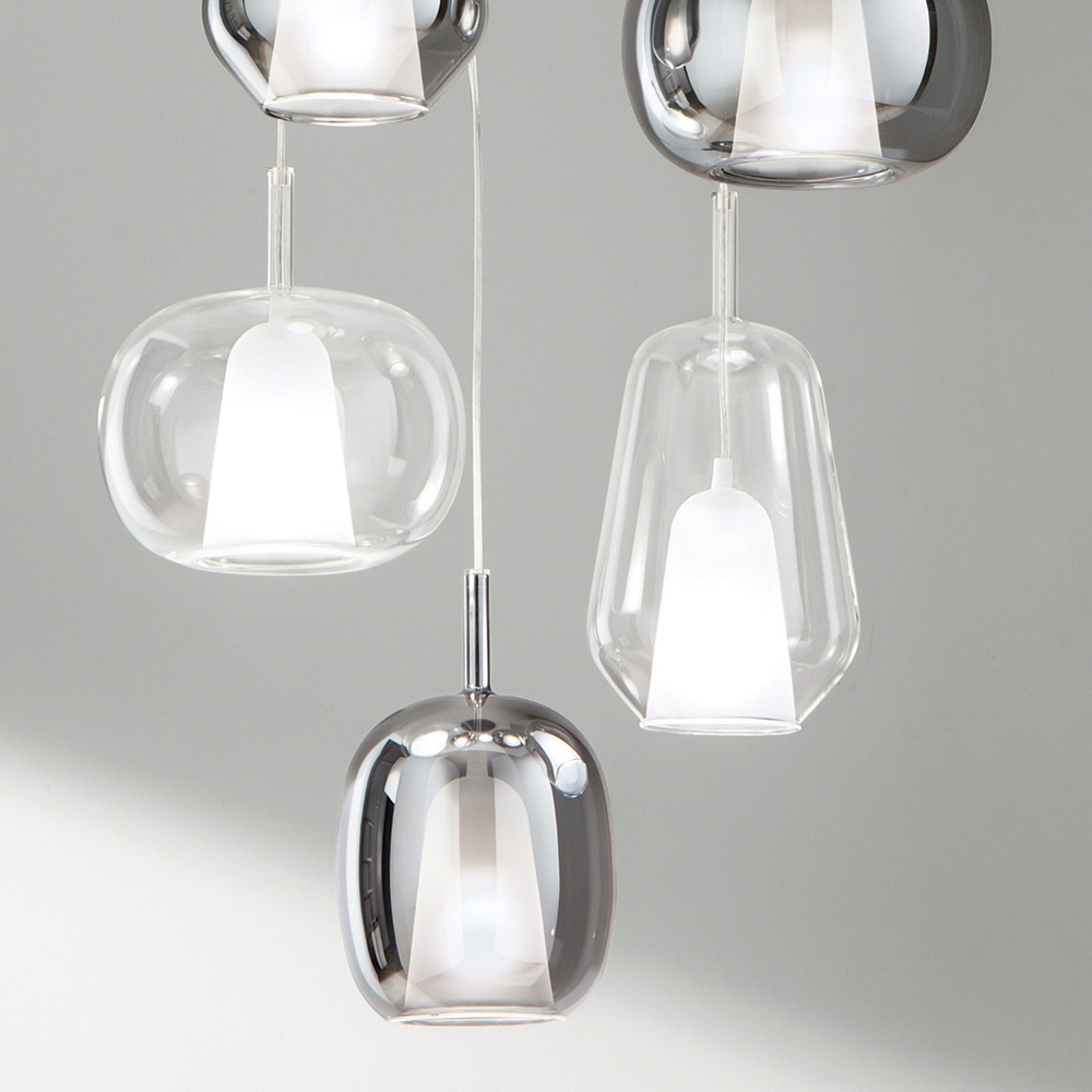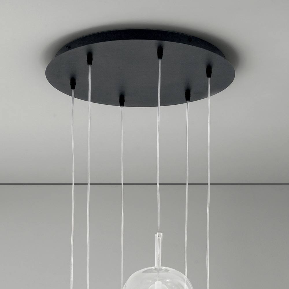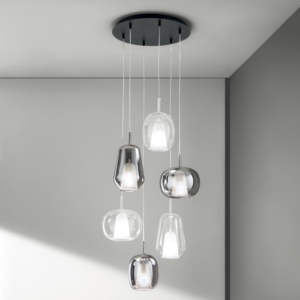 Odkryj urok wyrafinowanego oświetlenia z tym żyrandolem, zaprojektowanym, aby wnieść elegancję i ciepło do każdej przestrzeni. Dyfuzory, zawieszone na cienkim drucie, mają różne wykończenia, odbijając przyjazne i zapraszające światło, które wzbogaca otoczenie odrobiną wyrafinowanej nowoczesności .