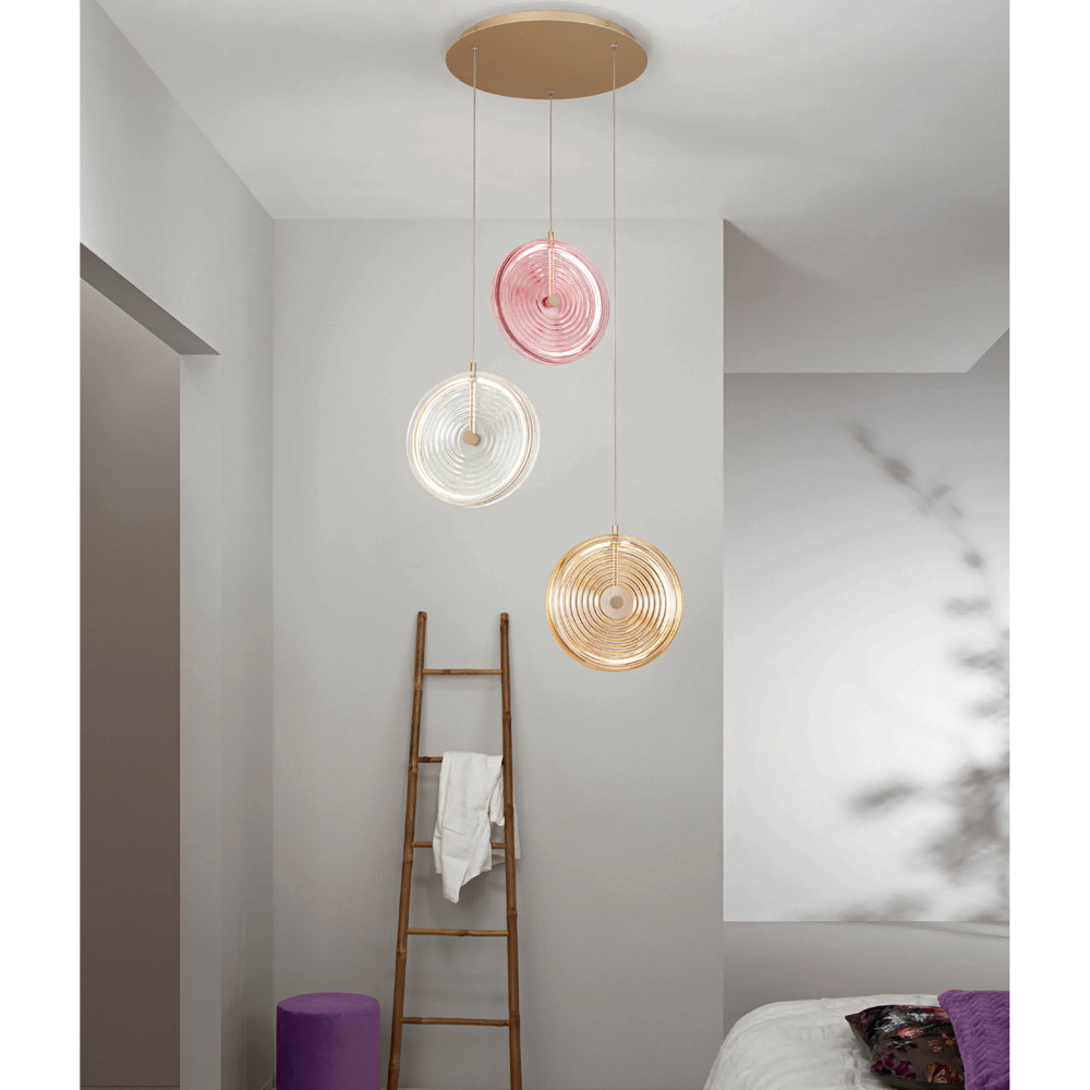 metalu malowanego na złoto, szkła ozdobionego koncentrycznymi bursztynowymi, różowymi i przezroczystymi liniami ze