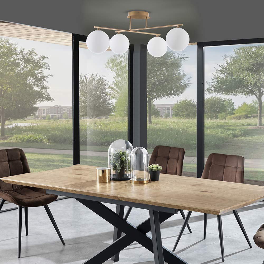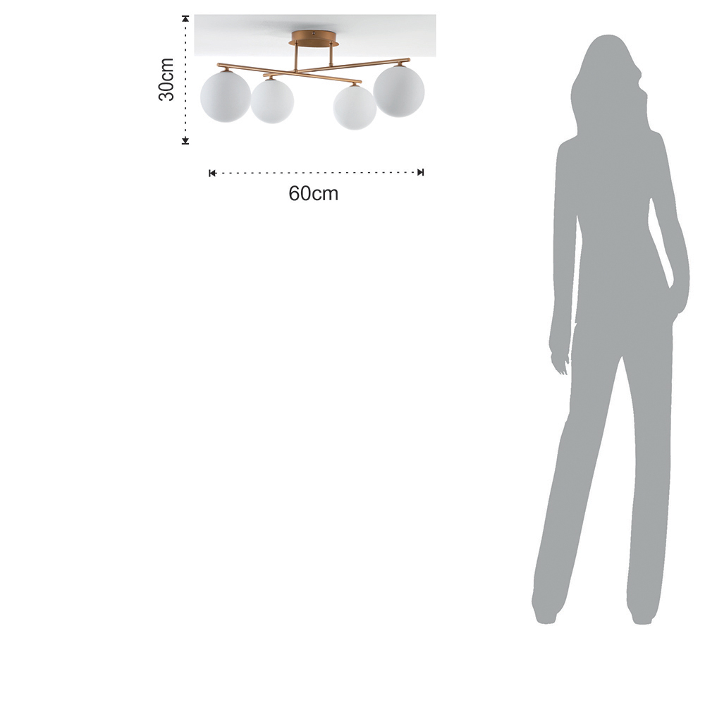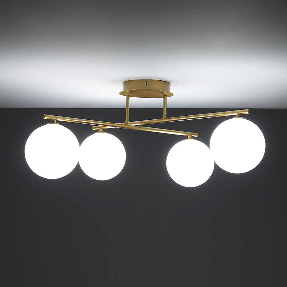 Ten żyrandol stanowi doskonały przykład eleganckiego i nowoczesnego designu , idealny do dodania odrobiny stylu i wyrafinowania każdemu otoczeniu. Dzięki czterem nieprzezroczystym szklanym kulom zawieszonym na metalowej konstrukcji żyrandol ten tworzy rozproszone i przyjemne oświetlenie, idealne do wnętrz takich jak jadalnia, salon, a nawet hol wejściowy.