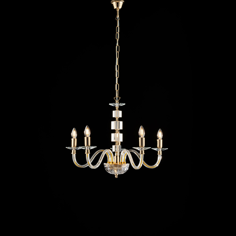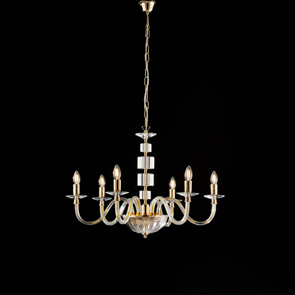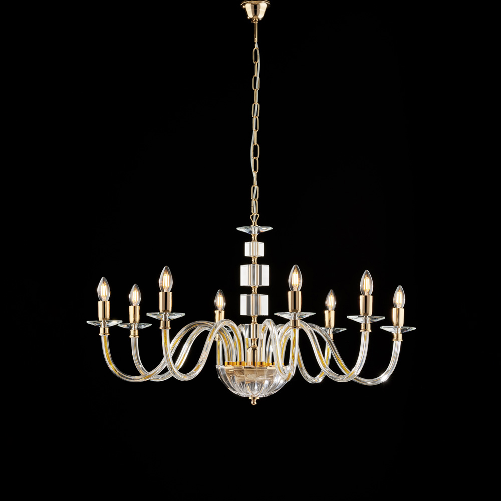 Dramatyczny i niezwykle wyrafinowany, ten luksusowy, złoty żyrandol z przezroczystym szkłem i kryształkami to niezwykle prestiżowa, świetlista kreacja, która doda blasku każdemu wnętrzu ponadczasową elegancją. Klasyczna konstrukcja z wygiętymi ramionami w kształcie świecy wzbogacona jest elementami z przezroczystego szkła i kryształkami , które potęgują światło, tworząc olśniewające i wyrafinowane refleksy.