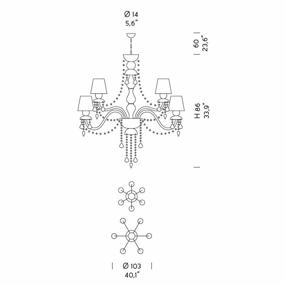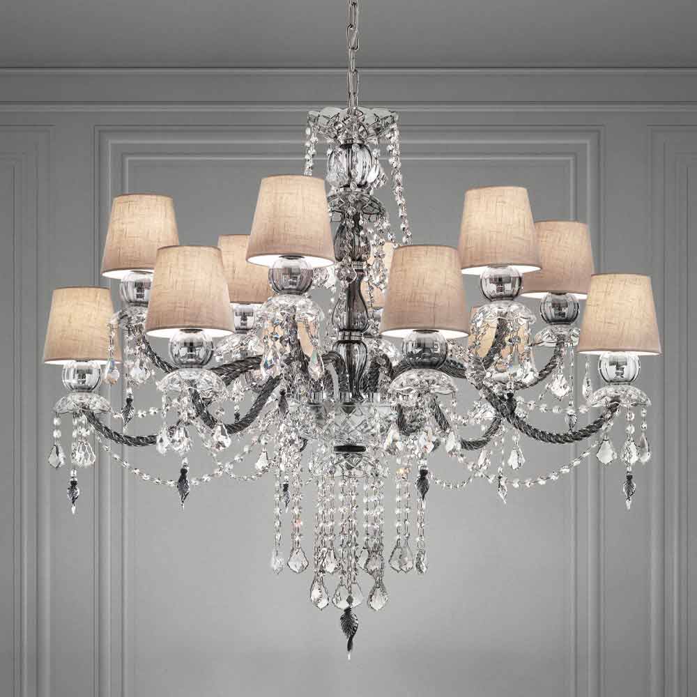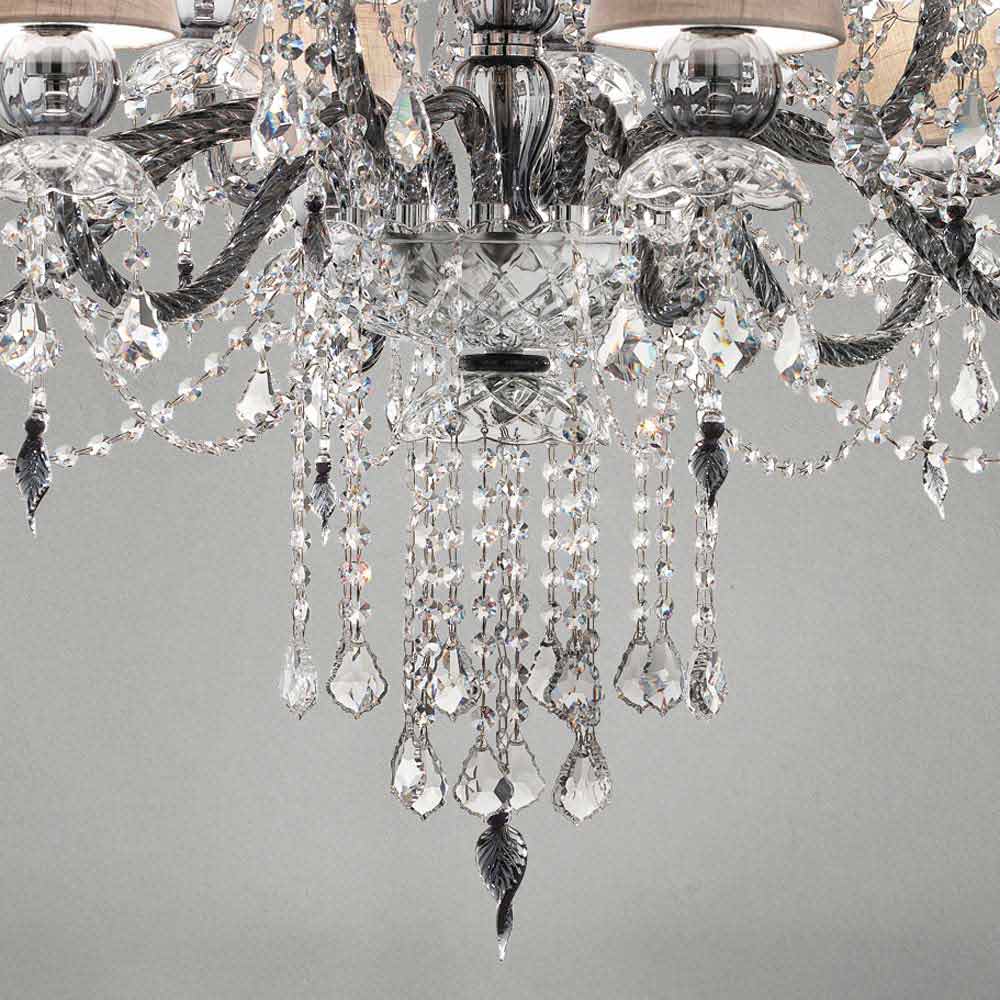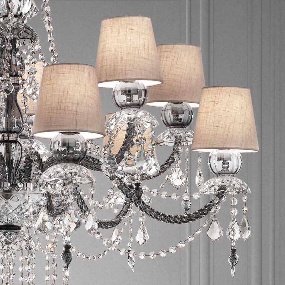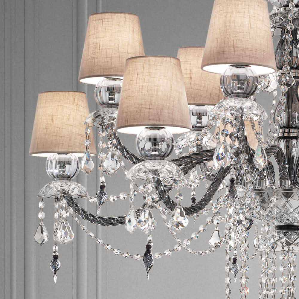 Elegancki i imponujący żyrandol z 12 lnianymi kloszami , struktura w wykończeniu z weneckiego szkła , wzbogacona kryształowymi wisiorkami i detalami z polerowanego chromowanego metalu , ręcznie robiona we Włoszech . Charakteryzujący się romantycznym charakterem, który w ekskluzywny sposób wypełnia duże pomieszczenia, ten żyrandol wyróżnia się świetlistymi wisiorkami i wyrafinowanymi kloszami, które ożywiają dynamiczne rozwiązanie wyposażenia o silnym wpływie scenograficznym . Dla podniesienia jego wartości i podkreślenia jego estetycznej strony jest obecność cekinów, które poprzez załamywanie światła ożywiają cudowną grę światła i cienia dzięki niespotykanym dotąd kolorowym błyskom .