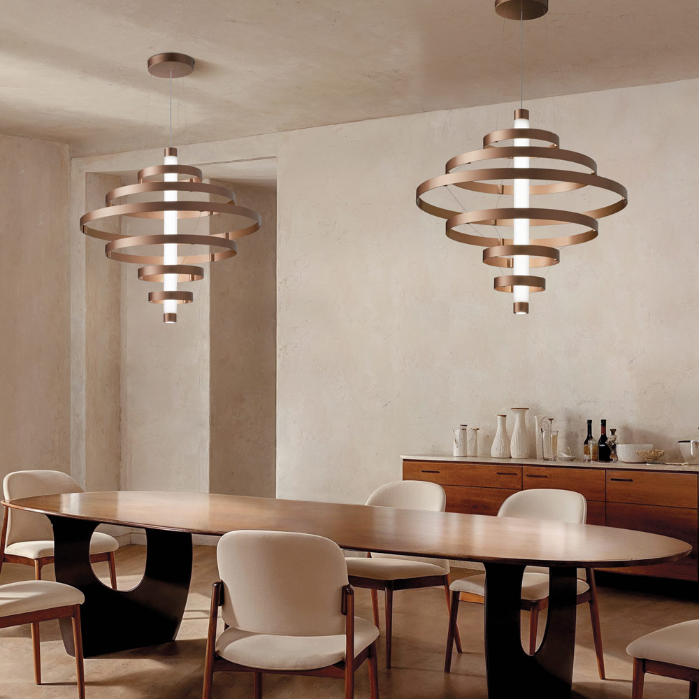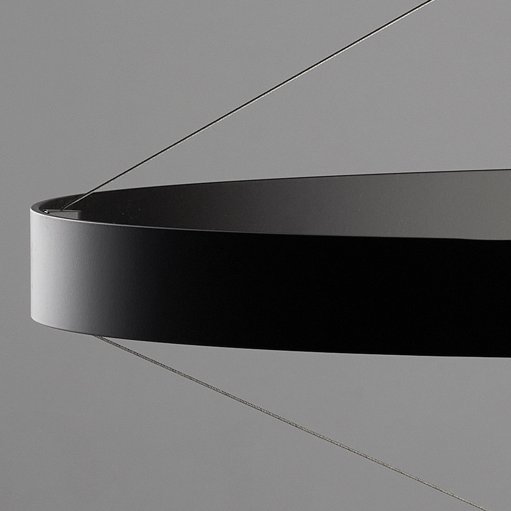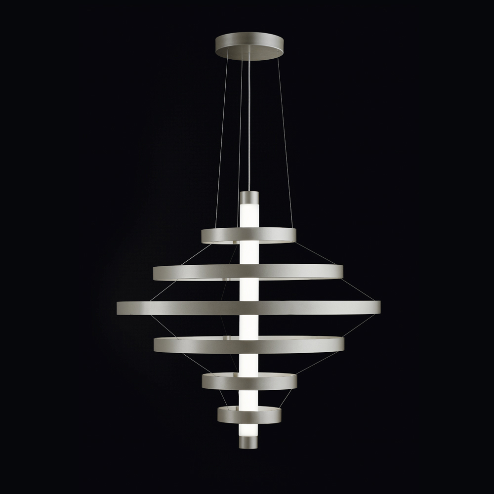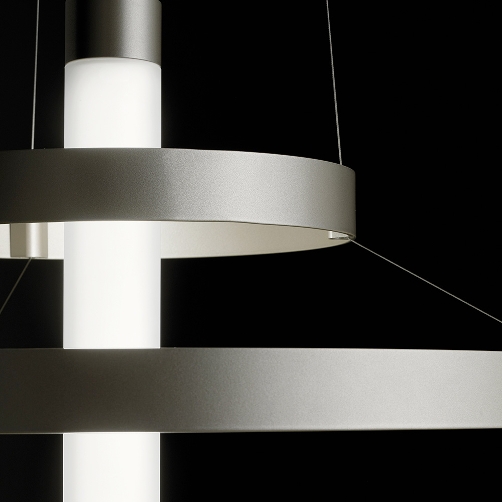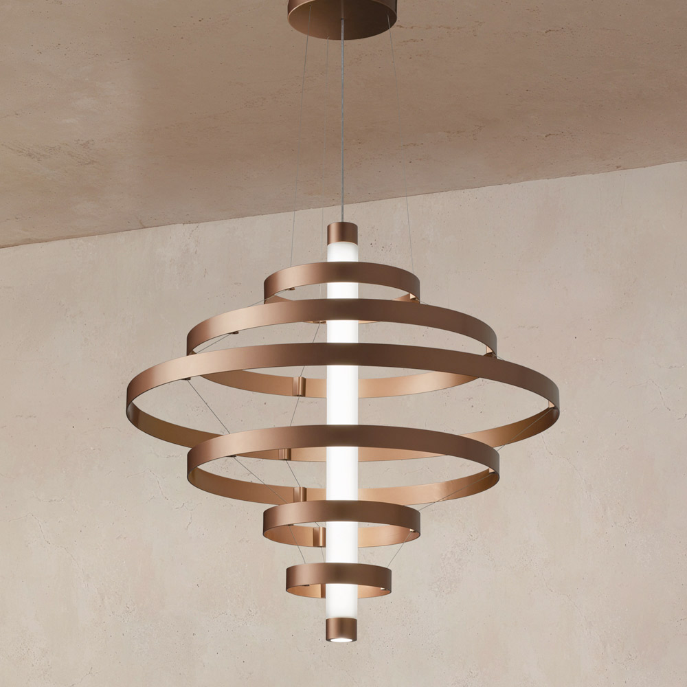 Ta lampa wisząca to prawdziwy bohater każdej przestrzeni: świetlista rzeźba, która przyciąga wzrok i dodaje otoczeniu charakteru i prestiżu . Konstrukcja składa się z szeregu koncentrycznych aluminiowych pierścieni , harmonijnie rozmieszczonych wokół centralnej części, tworząc dynamiczny, elegancki i trójwymiarowy efekt wizualny.